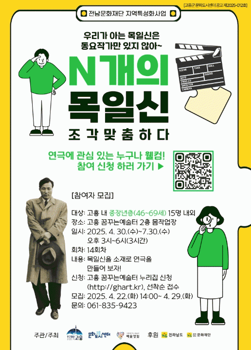 °íÈﱺ ¹®È­µµ½Ã¼¾ÅÍ(¼¾ÅÍÀå ¼­¼ºÈÆ)°¡ ¿À´Â 4¿ù 30ÀϺÎÅÍ °íÈï ²Þ²Ù´Â¿¹¼úÅÍ¿¡¼­ âÀÛ ¿¬±Ø ÇÁ·Î±×·¥¡®¸ñÀϽÅÀÇ ¼¼Æ÷µé¡¯À» ¿î¿µÇÑ´Ù°í ¹àÇû´Ù. °íÈï Ãâ½ÅÀÇ ¾Æµ¿¹®Çа¡ ¡®¸ñÀϽм±»ý¡¯ÀÇ »î°ú ÀÛǰÀ» ¼ÒÀç·Î ¿¬±ØÀ» âÀÛÇÏ´Â À̹ø ÇÁ·Î±×·¥Àº Áö¿ª ³» Áß¡¤Àå³âÃþÀ» Áß½ÉÀ¸·Î ¹®È­¿¹¼ú Âü¿©¸¦ È®´ëÇϰí, ÁֹΠ°£ ¼ÒÅë°ú °øµ¿Ã¼¼ºÀ» ³ôÀÌ´Â µ¥ ÀÇÀǰ¡ ÀÖ´Ù. ÇÁ·Î±×·¥Àº ¿À´Â 4¿ù 30ÀϺÎÅÍ 7¿ù 30ÀϱîÁö ¸ÅÁÖ ¼ö¿äÀÏ, °íÈï ²Þ²Ù´Â ¿¹¼úÅÍ¿¡¼­ ÁøÇàµÈ´Ù. ÃÑ 14ȸÂ÷ ¼ö¾÷À¸·Î ±¸¼ºµÇ¸ç, ¡ã¿ª»ç Àι° ÇнÀ ¡ã´ëº» âÀÛ ¡ã³ë·¡ ¹× ¾È¹« ¡ãÀǻ󡤼Òǰ Á¦ÀÛ ¡ã¿¬±Ø¿¬½À µî ´Ù¾çÇÑ ¿¹¼ú Ȱµ¿À» ÅëÇØ µÎ Â÷·ÊÀÇ Ã¢ÀÛ°ø¿¬À¸·Î ¸¶¹«¸®µÈ´Ù. ¼ö°­ ½ÅûÀº ¿À´Â 22ÀϺÎÅÍ 29ÀÏ È­¿äÀϱîÁö ²Þ²Ù´Â ¿¹¼úÅÍ È¨ÆäÀÌÁö¿¡¼­ °¡´ÉÇÏ´Ù. °íÈï ²Þ²Ù´Â¿¹¼úÅÍ °ü°èÀÚ´Â ¡°Áö¿ª °íÀ¯ÀÇ À̾߱⸦ ¿¹¼ú·Î Ç®¾î³»´Â À̹ø »ç¾÷À» ÅëÇØ °íÈï ÁֹεéÀÌ ÀÏ»ó ¼Ó¿¡¼­ ¹®È­¿¹¼úÀ» °æÇèÇϰí, Á¤¼­Àû ¾ÈÁ¤°ú »îÀÇ È°·ÂÀ» ¾ò´Â °è±â°¡ µÇ±æ ±â´ëÇÑ´Ù¡±°í ÀüÇß´Ù.