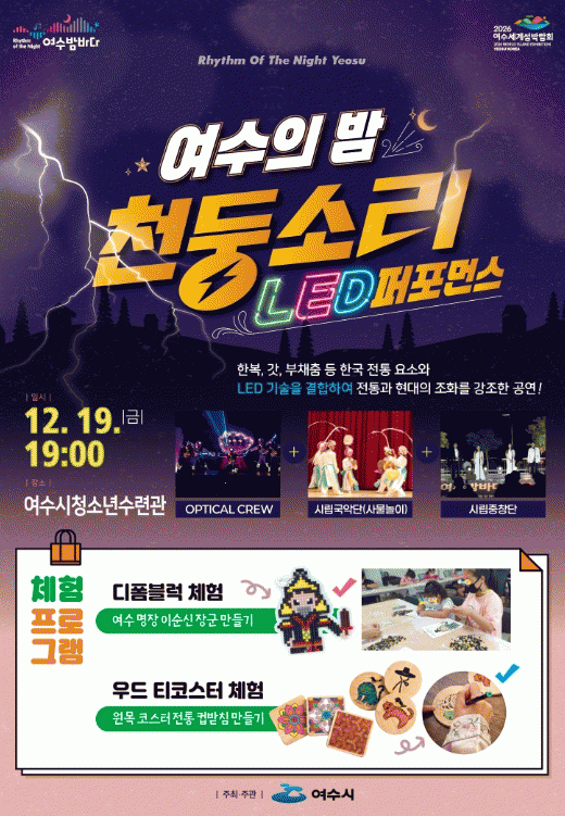 ¿©¼ö½Ã´Â ¿À´Â 19ÀÏ¿¡ ½ÖºÀµ¿¿¡ À§Ä¡ÇÑ ¿©¼ö½Ãû¼Ò³â¼ö·Ã°ü °ø¿¬Àå¿¡¼­ ¡®¿©¼öÀÇ ¹ã, õµÕ¼Ò¸®¡¯ 3ȸÂ÷ °ø¿¬À» °³ÃÖÇÑ´Ù. À̹ø 3ȸÂ÷´Â Çѱ¹ÀÇ ÀüÅë¹Ì¸¦ ´ãÀº ºÎäÃã°ú »ó¸ðµ¹¸®±â¸¦ LED ½Å±â¼ú, ·¹ÀÌÀú ÆÛÆ÷¸Õ½º¿Í °áÇÕÇØ ÀçÇØ¼®ÇÑ ºû¡¤Ã㡤Ÿ °ø¿¬ÀÌ ÆîÃÄÁú ¿¹Á¤ÀÌ´Ù. LED ´í½º °ø¿¬ À̿ܿ¡µµ ¿©¼ö½Ã¸³±¹¾Ç´ÜÀÇ »ç¹°³îÀÌ °ø¿¬°ú ½Ã¸³ÇÕâ´Ü ÁßâÆÀÀÇ Å©¸®½º¸¶½º ij·² µî ´Ù¾çÇÑ À帣ÀÇ °ø¿¬µµ ÁغñµÅ ÀÖ´Ù. ¶ÇÇÑ ¿©¼ö½Ã´Â °ø¿¬ÇÁ·Î±×·¥ ¿Ü¿¡µµ ¡®À̼ø½Å À屺 ºí·Ï ¸¸µé±â¡¯, ¡®ÀüÅë ¹«´Ì ÄÅ ¹Þħ ¸¸µé±â¡¯, À屺¸ð ¹× ÀüÅë °«À» ¾²°í Áñ±â´Â Æ÷ÅäÁ¸¡¯ µî ¿ª»ç¡¤¿¹¼ú °ü·Ã ´Ù¾çÇÑ Ã¼Çè ºÎ´ëÇÁ·Î±×·¥µµ ¹«·á·Î ¿î¿µÇÒ °èȹÀÌ´Ù. ¿©¼ö½Ã °ü°èÀÚ´Â ¡°¿¬¸»À» ¸Â¾Æ °¡Á·°ú ÇÔ²² Áñ±æ ¼ö ÀÖ´Â ½Å³ª°í »ö´Ù¸¥ °ø¿¬À» ÁغñÇß´Ù¡±¸ç ¡°¿ÃÇØ ¸¶Áö¸· ¾ß°£°ü±¤ Ưȭ ÄÜÅÙÃ÷¿¡ °ü±¤°´°ú ½Ã¹ÎµéÀÇ ¸¹Àº °ü½É°ú Âü¿©¸¦ ¹Ù¶õ´Ù¡±°í ¸»Çß´Ù. ±âŸ ÀÚ¼¼ÇÑ »çÇ×Àº ¿©¼ö½Ã °ü±¤°ú·Î ¹®ÀÇÇÏ¸é µÈ´Ù.