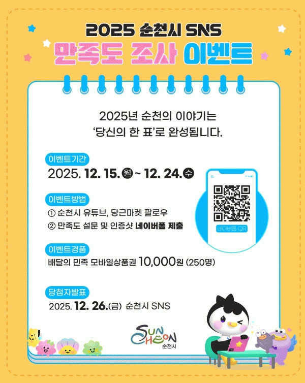 ¼øÃµ½Ã´Â ½Ã °ø½Ä SNS ä³Î ÀÌ¿ëÀÚµéÀ» ´ë»óÀ¸·Î ¡®2025³â ¼øÃµ½Ã SNS ¸¸Á·µµ Á¶»ç À̺¥Æ®¡¯¸¦ °³ÃÖÇÑ´Ù°í ¹àÇû´Ù. À̹ø Çà»ç´Â ½Ã¹ÎµéÀÌ ½ÃÁ¤ ¼Ò½ÄÀ» º¸´Ù ½±°í Àç¹ÌÀÖ°Ô Á¢ÇÒ ¼ö ÀÖµµ·Ï ¿î¿µ ÁßÀÎ ¼øÃµ½Ã °ø½Ä SNS ä³Î¿¡ ´ëÇØ ¸¸Á·µµ¸¦ Á¶»çÇϰí, SNS Âü¿©Çü À̺¥Æ®¸¦ ÅëÇØ ¼ÒÅëÀ» °­È­Çϱâ À§ÇØ ¸¶·ÃµÆ´Ù. Âü¿© ¹æ¹ýÀº ½Ã¿¡¼­ ¿î¿µÇÏ´Â SNS ä³Î À¯Æ©ºê¿Í ´ç±Ù¸¶ÄÏÀ» ±¸µ¶ÇÑ ÈÄ, ¿Â¶óÀÎ ¼³¹®Á¶»ç¿¡ ÀÀÇÑ ÀÌ¿ëÀÚ¸¦ ´ë»óÀ¸·Î ÁøÇàµÈ´Ù. ¼³¹®Á¶»ç¿Í À̺¥Æ®´Â 15ÀϺÎÅÍ 26ÀϱîÁö ¿î¿µµÉ ¿¹Á¤À̸ç, Ãß÷À» ÅëÇØ 250¸í¿¡°Ô ¸ð¹ÙÀÏ ±âÇÁƼÄÜÀ» ÁõÁ¤ÇÒ ¿¹Á¤ÀÌ´Ù. ½Ã °ü°èÀÚ´Â ¡°À̹ø Çà»ç´Â ¼øÃµ½Ã°¡ ¿î¿µÇÏ´Â SNS ä³ÎÀ» ÅëÇØ ½Ã¹Î°ú ´õ¿í °¡±îÀÌ ¼ÒÅëÇÏ°í ½Ã¹Î ÀǰßÀ» ¹Ý¿µÇϱâ À§ÇÑ ÀÚ¸®¡±¶ó¸ç ¡°¸¹Àº ½Ã¹ÎµéÀÇ Âü¿©¿Í ÇÔ²² ¼øÃµ½Ã SNS ä³Î¿¡ ¸¹Àº °ü½É°ú ±¸µ¶À» ºÎʵ台´Ù¡±°í ¸»Çß´Ù. ÇöÀç ½Ã´Â Ä«Ä«¿ÀÅå(¼øÃµ½Ãû), ÆäÀ̽ººÏ(¼øÃµ½Ã), ³×À̹ö ¹êµå(¼øÃµ½Ã), ÀνºÅ¸±×·¥, À¯Æ©ºê(¼øÃµ½Ã), ³×À̹ö ºí·Î±×(¼øÃµSNS), ´ç±Ù¸¶ÄÏ(¼øÃµ½Ãû), ½º·¹µå(¼øÃµ½Ã) µî 8°³ÀÇ SNS Ç÷§ÆûÀ» ¿î¿µÇϰí ÀÖÀ¸¸ç ¾à 20¸¸ ¸íÀÌ ±¸µ¶Çϰí ÀÖ´Ù.