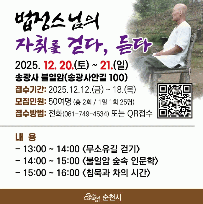 ¼øÃµ½Ã´Â ¹ýÁ¤½º´ÔÀÇ »î°ú Á¤½ÅÀ» ½Ã¹Îµé°ú ÇÔ²² ³ª´©±â À§ÇÑ Àι® üÇè ÇÁ·Î±×·¥ '¹ýÁ¤½º´ÔÀÇ ÀÚÃ븦 °È´Ù, µè´Ù'¸¦ ¿À´Â 20ÀϺÎÅÍ 21ÀϱîÁö ¼Û±¤»ç ºÒÀÏ¾Ï ÀÏ¿ø¿¡¼­ ¿î¿µÇÑ´Ù°í ¹àÇû´Ù. À̹ø ÇÁ·Î±×·¥Àº ¹ýÁ¤½º´ÔÀÇ ¼öÇà ÅÍÀüÀ̾ú´ø ºÒÀϾϿ¡¼­ ÁøÇàµÇ´Â ½Ã¹Î Âü¿©Çü Àι® ÇÁ·Î±×·¥À¸·Î, ÃÑ 2ȸ(ȸ´ç 25¸í) ¿î¿µÇϸç ÃÑ 50¿© ¸íÀÌ Âü¿©ÇÒ ¼ö ÀÖ´Ù. Á¢¼ö´Â ¿À´Â 18ÀϱîÁö ÀüÈ­(061-749-4534) ¶Ç´Â QRÄÚµå·Î ½Åû °¡´ÉÇÏ´Ù. ƯÈ÷ À̹ø ÇÁ·Î±×·¥Àº ÃÖ±Ù ¿¹ºñ¹®È­À¯»êÀ¸·Î ¼±Á¤µÈ ¡®¹ýÁ¤½º´Ô ºü»ß¿ë ÀÇÀÚ¡¯¿Í ÇÔ²² ¼Ò°³µÇ¾î ±× Àǹ̰¡ ´õ¿í ±í´Ù. ¡®¹ýÁ¤½º´Ô ºü»ß¿ë ÀÇÀÚ¡¯´Â ¹ýÁ¤½º´ÔÀÌ ¼öÇà°ú »çÀ¯ÀÇ ½Ã°£À» º¸³Â´ø »ó¡Àû °ø°£À» º¸¿©ÁÖ´Â À¯»êÀ¸·Î, ½º´ÔÀÇ ¼Ò¹ÚÇÑ »î°ú ¹«¼ÒÀ¯ Á¤½ÅÀ» ´ëÇ¥ÇÏ´Â ¹®È­Àû °¡Ä¡°¡ ³ô°Ô Æò°¡µÈ ¹Ù ÀÖ´Ù. ÇÁ·Î±×·¥Àº ¡ã¹ýÁ¤½º´ÔÀÇ ¼öÇà ¿©Á¤À» µû¶ó °È´Â ¡®¹«¼ÒÀ¯±æ °È±â¡¯ ¡ã½º´ÔÀÇ »î°ú »ç»ó¿¡ ´ëÇÑ Àι®ÇÐ °­ÀÇ ¡®ºÒÀÏ¾Ï ½£¼Ó Àι®ÇС¯ ¡ã°í¿ä ¼Ó¿¡¼­ Â÷¿Í ÇÔ²²ÇÏ´Â ¸í»ó ¹× ¼ºÂûÀÇ ½Ã°£À» °®´Â ¡®Ä§¹¬°ú Â÷ÀÇ ½Ã°£¡¯À¸·Î ÁøÇàµÈ´Ù. ½Ã °ü°èÀÚ´Â ¡°À̹ø ÇÁ·Î±×·¥À» ÅëÇØ ¿¹ºñ¹®È­À¯»êÀ¸·Î ¼±Á¤µÈ ¡®¹ýÁ¤½º´Ô ºü»ß¿ë ÀÇÀÚ¡¯¿Í ÇÔ²² ¹ýÁ¤½º´ÔÀÇ Á¤½ÅÀ» °ø°¨ÇÏ°í ¼ºÂûÇÏ´Â ÀÇ¹Ì ÀÖ´Â ½Ã°£ÀÌ µÇ±æ ¹Ù¶õ´Ù¡±¸ç, ¡°¾ÕÀ¸·Îµµ Áö¿ªÀÇ ¿ª»ç?¹®È­ ÀÚ¿øÀ» Ȱ¿ëÇÑ ½Ã¹Î Áß½ÉÀÇ Àι® ÇÁ·Î±×·¥À» Áö¼ÓÀûÀ¸·Î ¿î¿µÇϵµ·Ï ³ë·ÂÇϰڴ١±°í ¸»Çß´Ù.