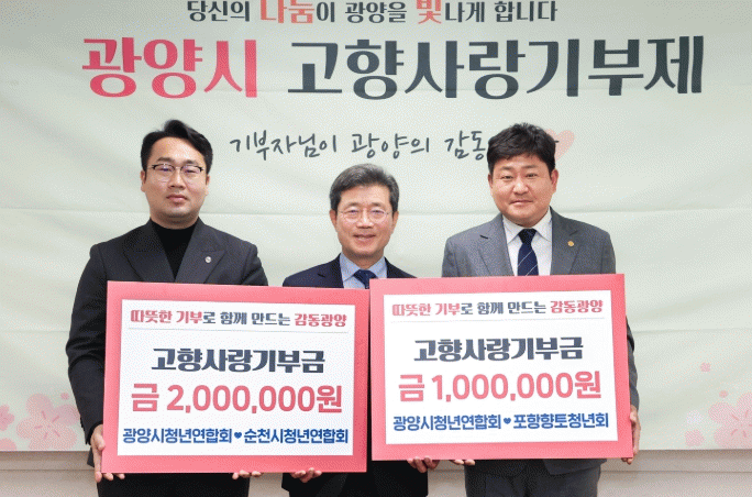 ±¤¾ç½Ã´Â 15ÀÏ ½Ãû ¸¸³²½Ç¿¡¼­ ±¤¾ç½Ãû³â¿¬ÇÕȸ(ȸÀå ¾ÈŸ±¹) ȸ¿ø Àϵ¿ÀÇ °íÇâ»ç¶û±âºÎ±Ý Àü´Þ½ÄÀÌ ¿­·È´Ù°í ¹àÇû´Ù. ±¤¾ç½Ãû³â¿¬ÇÕȸ´Â ÀڸŰῬ û³â´Üüµé°ú °íÇâ»ç¶û »óÈ£±âºÎÀÇ ÃëÁö¸¦ °øÀ¯ÇÏ¸ç »óÈ£±âºÎ¸¦ ÃßÁøÇßÀ¸¸ç, Æ÷Ç×ÇâÅäû³âȸ¿Í 100¸¸ ¿ø, ¼øÃµ½Ãû³â¿¬ÇÕȸ¿Í 200¸¸ ¿øÀ» »óÈ£ ±âºÎÇØ ÃÑ 300¸¸ ¿øÀ» ±âŹÇß´Ù. ±¤¾ç½Ãû³â¿¬ÇÕȸ´Â Áö³­ÇØ¿¡µµ Æ÷Ç×ÇâÅ䡤Á¦Áֽ᤿µÃµ½Ã¡¤¼øÃµ½Ã 4°³ ÁöÀÚü û³â¿¬ÇÕȸ¿Í ´Üüº° 200¸¸ ¿ø¾¿ ÃÑ 800¸¸ ¿øÀ» »óÈ£ ±âºÎÇÏ¸ç °íÇâ»ç¶û±âºÎÁ¦ È®»ê¿¡ Àû±Ø Âü¿©ÇÑ ¹Ù ÀÖ´Ù. ¿ÃÇØ±îÁö À̾îÁø »óÈ£±âºÎ´Â °íÇâ»ç¶û±âºÎÁ¦¸¦ ¸Å°³·Î ÇÑ Ã»³â´Üü °£ ¿¬´ë¿Í »ó»ýÀÇ ¸ð¹ü»ç·Ê·Î Æò°¡µÈ´Ù. ¾ÈŸ±¹ ±¤¾ç½Ãû³â¿¬ÇÕȸ ȸÀåÀº ¡°°íÇâ»ç¶û±âºÎÁ¦¸¦ ÅëÇØ û³âµéÀÌ °íÇâ ¹ßÀü¿¡ Á÷Á¢ ÈûÀ» º¸ÅÅ ¼ö ÀÖ¾î ´õ¿í ¶æ±í´Ù¡±¸ç ¡°À̹ø »óÈ£±âºÎ°¡ û³â´Üü¸¦ ³Ñ¾î Áö¿ª»çȸ Àü¹ÝÀ¸·Î È®»êµÅ °íÇâÀÇ Áö¼Ó °¡´ÉÇÑ ¼ºÀå¿¡ Å« ÈûÀÌ µÇ±æ ¹Ù¶õ´Ù¡±°í ¸»Çß´Ù. ½Ã °ü°èÀÚ´Â ¡°±¤¾ç½ÃÀÇ µçµçÇÑ ¹Ì·¡ ÁÖ¿ªÀΠû³âµéÀÌ °íÇâÀ» À§ÇØ ¶æÀ» ¸ð¾ÆÁà Å« ÈûÀÌ µÈ´Ù¡±¸ç ¡°Ã»³âµéÀÌ ÀںνÉÀ» °¡Áö°í Ȱ¹ßÈ÷ Ȱµ¿ÇÒ ¼ö ÀÖµµ·Ï °ü·Ã Á¤Ã¥ ¹ß±¼°ú ½ÃÁ¤ ¹ßÀü¿¡ ´õ¿í Èû¾²°Ú´Ù¡±°í ¹àÇû´Ù.