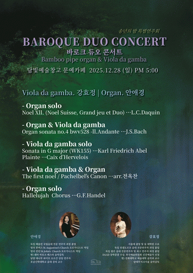 ´ã¾ç±º¹®È­Àç´ÜÀº ¿À´Â 28ÀÏ ¿ÀÈÄ 5½Ã ´ãºû¿¹¼úâ°í ¹®¿¹Ä«Æä¿¡¼­ ¡º2025 ´ãºû¿¹¼úâ°í ¼Û³âƯº°¿¬ÁÖȸ ¡®¹Ù·ÎÅ© µà¿À Äܼ­Æ®¡¯¡»¸¦ ÁøÇàÇÑ´Ù°í ¹àÇû´Ù. À̹ø °ø¿¬Àº 2015³âºÎÅÍ ²ÙÁØÈ÷ ÁøÇàÇØ ¿Ô´ø ´ãºû¿¹¼úâ°í ´ë³ª¹« ÆÄÀÌÇÁ ¿À¸£°£ Á¤±â¿¬ÁÖȸÀÇ ÀÏȯÀ¸·Î, ÇÑ ÇØ¸¦ ¸¶¹«¸®ÇÏ´Â Àǹ̿¡¼­ ¹Ù·ÎÅ© ½Ã´ëÀÇ ´ëÇ¥Àû ¾Ç±âÀÎ ºñ¿Ã¶ó ´Ù °¨¹Ù¿Í µà¿À Äܼ­Æ® Çü½ÄÀ» ºô¾î ¼­Á¤¼º°ú Àå¾öÇÔÀÇ Á¶È­·Î¿òÀ» ¼±»çÇÒ ¿¹Á¤ÀÌ´Ù. ±¹³» À¯ÀÏÀÇ ´ë³ª¹« ÆÄÀÌÇÁ ¿À¸£°£ ¿¬ÁÖ´Â ´ãºû¿¹¼úâ°í Á¤±â¿¬ÁÖȸ »óÀÓ¿¬ÁÖÀÚ ¾È¾Ö°æÀÇ ¿¬ÁÖ¿Í °îÇØ¼³ÀÌ ÇÔ²² °çµé¿©Áö¸ç, Àϻ󿡼­ ½±°Ô Á¢Çϱ⠾î·Á¿î ¾Ç±âÀÎ ºñ¿Ã¶ó ´Ù °¨¹Ù ¿¬ÁÖ´Â ±¹³»¿Ü¿¡¼­ Ȱ¹ßÈ÷ Ȱµ¿Çϸç Çѱ¹À» ´ëÇ¥Çϰí ÀÖ´Â °­È¿Á¤ ¿¬ÁÖÀÚ°¡ ¸Ã¾Ò´Ù. Àç´Ü °ü°èÀÚ´Â, ¡°´Ü¼øÇÑ À½¾Ç °¨»óÀ» ³Ñ¾î, ¹Ù·ÎÅ© ½Ã´ë ¾Ç±âÀÇ ¿¹¼úÀû °¡Ä¡¿Í ´ã¾çÀÌ Áö´Ñ ¹®È­Àû Ư¼ºÀ» ÇÔ²² ü°¨Çϸç ÇÑ ÇØ¸¦ Æí¾ÈÇÏ°í µû½ºÇÏ°Ô ¸¶¹«¸®ÇÒ ¼ö Àֱ⸦ ¹Ù¶ó´Â ¸¶À½À» ´ã¾Æ ÁغñÇÑ °ø¿¬ÀÌ´Ù.¡±°í ¸»Çϸç, ¡°´ã¾çÀÇ °æ°üÀÎ °ü¹æÃµ°ú °ü¹æÁ¦¸²ÀÇ Ç³Ä¡¸¦ °¡µæ ´À³¥ ¼ö ÀÖ´Â ¹®È­Àç»ý°ø°£ ´ãºû¿¹¼úâ°í ¹®¿¹Ä«Æä¿¡ ¹æ¹®ÇÏ¿© 2025³â ÇÑ ÇØ¸¦ µÇ»õ±â´Â ¼ÒÁßÇÑ Ãß¾ïÀ» ´ã¾Æ °¡¼ÌÀ¸¸é ÇÑ´Ù.¡±°í ¸»Çß´Ù.