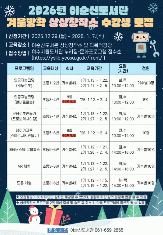 ¿©¼ö½Ã´Â 12¿ù 29ÀϺÎÅÍ 2026³â 1¿ù 7ÀϱîÁö ¡®2026³â À̼ø½Åµµ¼­°ü °Ü¿ï¹æÇÐ »ó»óâÀÛ¼Ò¡¯ ¼ö°­»ýÀ» ¼±Âø¼ø ¸ðÁýÇÑ´Ù. À̹ø ÇÁ·Î±×·¥Àº °ü³» ÃʵîÇлýÀ» ´ë»óÀ¸·Î ÇÏ´Â 7°³ °­Á·Π±¸¼ºµÇ¸ç, 2026³â 1¿ù 12ÀϺÎÅÍ 2¿ù 5ÀϱîÁö ¿î¿µµÈ´Ù. °³¼³ °­Á´ ¡ã¾î¸°ÀÌ ·Îº¿ üÇè(ºñ´©·Îº¿) ¡ãÀΰøÁö´ÉÄÚµù(¾Ë¹öÆ®·Îº¿) ¡ãÄÚµù·Îº¿ ¸¸µé±â(ÇÁ·Îº¸ÀÍ»çÀÌÆÃ) ¡ã¸ÞÀÌÄ¿±³À°(½º¸¶Æ®½ÃƼ ¸¸µé±â) ¡ã¸ÞŸ¹ö½º¿Í ·Îºí·Ï½º ¡ãVRüÇè ¡ãµå·ÐüÇè µî 7°³ °­Á´Ù. °­Áº° 10¸í ³»¿Ü ¼ö°­»ýÀ» ¼±Âø¼øÀ¸·Î ¸ðÁýÇϸç, Âü°¡ Èñ¸ÁÀÚ´Â ¿©¼ö½Ã¸³µµ¼­°ü ´©¸®Áý¿¡¼­ º»ÀÎ ¶Ç´Â º¸È£ÀÚ°¡ ½ÅûÇÏ¸é µÈ´Ù. ±âŸ ÀÚ¼¼ÇÑ »çÇ×Àº À̼ø½Åµµ¼­°üÀ¸·Î ¹®ÀÇÇÏ¸é µÈ´Ù. ½Ã °ü°èÀÚ´Â ¡°°Ü¿ï¹æÇÐÀ» ¸Â¾Æ ÃʵîÇлýµéÀÌ µµ¼­°üÀ» ÅëÇØ ´Ù¾çÇÑ ÀΰøÁö´É ÄÜÅÙÃ÷¸¦ Á¢ÇÒ ¼ö ÀÖµµ·Ï ÇÁ·Î±×·¥À» ¸¶·ÃÇß´Ù¡±¸ç ¡°¾î¸°À̵éÀÇ ¸¹Àº ½ÅûÀ» ¹Ù¶õ´Ù¡±°í ¸»Çß´Ù.
