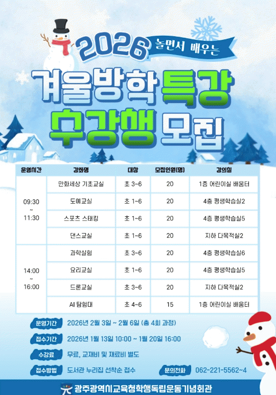 ±¤Áֽñ³À°Ã»Çлýµ¶¸³¿îµ¿±â³äȸ°üÀº °Ü¿ï¹æÇÐÀ» ¸Â¾Æ ¿À´Â 2¿ù 3~6ÀÏ ¡®°Ü¿ï¹æÇРƯ°­¡¯À» ¿î¿µÇÑ´Ù. À̹ø Ư°­Àº ÃʵîÇлýµéÀÌ ¹æÇÐ ±â°£ üÇè Áß½É È°µ¿À» ÅëÇØ °ÇÀüÇÑ ¿©°¡ÀÇ Áñ°Å¿òÀ» ´À³¢°í ¹è¿ò¿¡ ´ëÇÑ ½Ã¾ß¸¦ ³ÐÈú ¼ö ÀÖµµ·Ï Áö¿øÇϱâ À§ÇØ ¸¶·ÃµÆ´Ù. ´ë»óÀº ÃʵîÇлýÀ¸·Î, ¼±Âø¼ø 155¸íÀ» ¸ðÁýÇÑ´Ù. Ư°­Àº ¡ã¸¸È­¼¼»ó ±âÃʱ³½Ç ¡ãµµ¿¹±³½Ç ¡ã½ºÆ÷Ã÷ ½ºÅÂÅ· ¡ã´í½º±³½Ç ¡ã°úÇнÇÇè ¡ã¿ä¸®±³½Ç ¡ãµå·Ð±³½Ç ¡ãAI ŽÇè´ë µî 8°³ °­Á·Π±¸¼ºµÆ´Ù. ¼ö°­·á´Â ¹«·á´Ù. ´Ü, ±³Àçºñ ¹× Àç·áºñ´Â ¼ö°­»ýÀÌ ºÎ´ãÇØ¾ß ÇÑ´Ù. ¼ö°­½ÅûÀº ¿À´Â 13ÀÏ ¿ÀÀü 10½ÃºÎÅÍ 20ÀÏ ¿ÀÈÄ 4½Ã±îÁö ´©¸®Áý ¿Â¶óÀÎ ¼ö°­½Åû °Ô½ÃÆÇÀ» ÅëÇØ ÇÏ¸é µÈ´Ù. ÀÚ¼¼ÇÑ ³»¿ëÀº ȸ°ü ´©¸®Áý ¶Ç´Â ¹®ÇåÁ¤º¸°ú·Î ¹®ÀÇÇÏ¸é µÈ´Ù. Çлýµ¶¸³¿îµ¿±â³äȸ°ü ±è¿ëÀÏ °üÀåÀº ¡°°Ü¿ï¹æÇРƯ°­Àº ÇлýµéÀÌ ±³½Ç ¹Û¿¡¼­ ´Ùä·Î¿î °æÇèÀ» Çϸç âÀǼºÀ» °®Ãá ÀÎÀç·Î ¼ºÀåÇÏ´Â ¹Ø°Å¸§ÀÌ µÉ °Í¡±À̶ó¸ç ¡°ÇлýµéÀÇ ¹ß´Þ ´Ü°è¿Í Èï¹Ì¸¦ °í·ÁÇÑ ¸ÂÃãÇü ±³À° ÇÁ·Î±×·¥À» Áö¼ÓÀûÀ¸·Î ¹ß±¼ÇØ ¿î¿µÇϰڴ١±°í ¸»Çß´Ù.