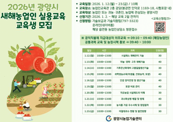 ±¤¾ç½Ã´Â 1¿ù 12ÀϺÎÅÍ 1¿ù 23ÀϱîÁö¡®2026³â »õÇØ³ó¾÷ÀÎ ½Ç¿ë±³À°¡¯À» ½Ç½ÃÇÑ´Ù°í ¹àÇû´Ù. »õÇØ³ó¾÷ÀÎ ½Ç¿ë±³À°Àº ³ó¾÷Á¤Ã¥°ú ¿¬°èÇÑ ±³À°À» ÅëÇØ °ü³» ³ó¾÷ÀÎÀÇ »õÇØ ¿µ³ó°èȹÀ» ¼ö¸³À» Áö¿øÇϰí, ÀÛ¹°º° Àç¹è±â¼ú°ú º´ÇØÃæ °ü¸® ±³À°À» ÅëÇØ °íǰÁú ³ó»ê¹° »ý»ê°ú ³ó¾÷¼Òµæ Áõ´ë¿¡ ±â¿©ÇϰíÀÚ ¸Å³â ¿î¿µµÇ°í ÀÖ´Ù. À̹ø ±³À°Àº ±¤¾ç½Ã³ó¾÷±â¼ú¼¾ÅÍ ½ÃÇèÆ÷Àå ³» ³ó¾÷Àα³À°°ü¿¡¼­ ÁøÇàµÇ¸ç, ´Ü°¨, ½Ã¼³Ã¤¼Ò ¹× ³ëÁöä¼Ò, Ä¡À¯³ó¾÷, ³ó½Äǰ °¡°ø â¾÷, ¾Æ¿­´ë°ú¼ö µî ÃÑ 10°³ÀÇ Àü¹®°úÁ¤À¸·Î ¿î¿µµÉ ¿¹Á¤ÀÌ´Ù. ¶ÇÇÑ ¸Å³â Á¤·ÊÀûÀ¸·Î ½Ç½ÃÇÏ´Â °øÀÍÁ÷ºÒÁ¦ Àǹ«±³À°À» ±³À° ½ÃÀÛ Àü¿¡ º´Çà ¿î¿µÇØ °øÀÍÁ÷ºÒ±Ý Áö±Þ ´ë»ó ³ó¾÷ÀÎÀÇ Á¦µµ ÀÌÇØ¸¦ µ½°í Áؼö»çÇ×À» ¾È³»ÇÒ °èȹÀÌ´Ù. ¾Æ¿ï·¯ ³ó¾÷°æ¿µÃ¼ µî·ÏÁ¤º¸ °»½Å ¾Û ¡®³ó¾÷eÁö¡¯ È«º¸¿Í ³óÀÛ¾÷ Áß ºó¹øÇÏ°Ô ¹ß»ýÇÏ´Â »ç°í¸¦ ¿¹¹æÇϱâ À§ÇÑ ³óÀÛ¾÷ ¾ÈÀü±³À°µµ ÇÔ²² ½Ç½ÃÇØ ÇöÀå¿¡¼­ ¹Ù·Î Ȱ¿ëÇÒ ¼ö ÀÖ´Â ½Ç¿ëÀûÀÎ ±³À° ³»¿ëÀ» Á¦°øÇÑ´Ù. ÇØ´ç ±³À°Àº ±¤¾ç½Ã ³ó¾÷ÀÎÀÌ¸é ´©±¸³ª Âü¿©ÇÒ ¼ö ÀÖÀ¸¸ç, ÀüÈ­ ¶Ç´Â ¿Â¶óÀÎ(³×À̹öÆû), ÁÖ¼ÒÁö Á¦ÇÑ ¾øÀÌ °¡±î¿î À¾¡¤¸é¡¤µ¿ ³ó¾÷Àλó´ã¼Ò¸¦ ÅëÇØ ¼ö°­À» Èñ¸ÁÇÏ´Â ±³À°ÀÏ ±âÁØ 2ÀÏ Àü±îÁö ½ÅûÇÏ¸é µÈ´Ù. ±¤¾ç½Ã °ü°èÀÚ´Â ¡°»õÇØ³ó¾÷ÀÎ ½Ç¿ë±³À°Àº ±âÈÄ¿Í ³ó¾÷ȯ°æ º¯È­¿¡ ´ëÀÀÇϰí, °íǰÁú ³ó»ê¹° »ý»êÀ» À§ÇÑ Àç¹è±â¼úÀ» ½ÀµæÇØ ³ó°¡¼Òµæ Áõ´ë¿¡ µµ¿òÀÌ µÇ´Â ±³À°¡±À̶ó¸ç ¡°°ü½É ÀÖ´Â ³ó¾÷Àΰú ½Ã¹Î ¿©·¯ºÐÀÇ ¸¹Àº Âü¿©¸¦ ¹Ù¶õ´Ù¡±°í ¸»Çß´Ù. ±âŸ ÀÚ¼¼ÇÑ ³»¿ëÀº ±¤¾ç½Ã³ó¾÷±â¼ú¼¾ÅÍ ´©¸®Áý °øÁö»çÇ×À» È®ÀÎÇϰųª, ±â¼úº¸±Þ°ú ±â¼úÁö¿øÆÀÀ¸·Î ¹®ÀÇÇÏ¸é µÈ´Ù.