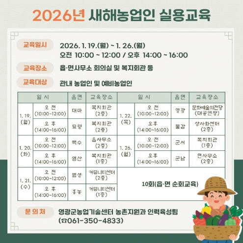 ¿µ±¤±ºÀº ¿À´Â 1¿ù 19ÀϺÎÅÍ 26ÀϱîÁö °¢ À¾¡¤¸é¿¡¼­ ³ó¾÷ÀÎ 1,800¸íÀ» ´ë»óÀ¸·Î ¡°2026³â »õÇØ ³ó¾÷ÀÎ ½Ç¿ë±³À°¡±À» ½Ç½ÃÇÑ´Ù°í ¹àÇû´Ù. »õÇØ ³ó¾÷ÀÎ ½Ç¿ë±³À°Àº ¸Å³â ÃÊ ³ó¾÷±â¼ú¼¾ÅÍ¿¡¼­ ÁÖ°üÇÏ´Â ÇÁ·Î±×·¥À¸·Î, Áö³­ÇØ ³ó¾÷ÀÇ ¼º°ú¸¦ µÇµ¹¾Æº¸°í »õ·Î¿î ¿µ³ó°èȹÀ» ¼ö¸³Çϱâ À§ÇØ ½Ç½ÃÇÏ´Â ±³À°ÀÌ´Ù. ¿ÃÇØ´Â ÀÌ»ó±âÈÄ·Î ¹ß»ý ¾ç»óÀÌ ´Þ¶óÁø º´ÇØÃæÀÇ È¿À²ÀûÀÎ ¹æÁ¦¹æ¹ý°ú, ÁÖ¿ä ÀÛ¸ñº° »ý»êºñ Àý°¨±â¼úÀ» ÁßÁ¡ÀûÀ¸·Î ÁöµµÇÏ´Â ±³À°À¸·Î Æí¼ºÇß´Ù. À̹ø ±³À°Àº °¢ À¾¡¤¸é»ç¹«¼Ò ȸÀǽǰú º¹Áöȸ°ü µî¿¡¼­ ½Ç½ÃÇϸç, °øÀÍÁ÷ºÒÁ¦ Àǹ«±³À°À» ÇÔ²² ¿î¿µÇÒ °èȹÀÌ´Ù. ¶ÇÇÑ, ¿µ»óÀڷḦ Ȱ¿ëÇØ ³ó¾÷ÀÎ ¾ÈÀü±³À°°ú ³ó¾÷eÁö(Â÷¼¼´ë ³ó¾÷ÀÎ ¸ÂÃãÆ÷ÅÐ) ±³À°µµ º´ÇàÇÒ ¿¹Á¤ÀÌ´Ù. Á¤Àç¿í ³ó¾÷±â¼ú¼¾ÅͼÒÀåÀº ¡°À̹ø ±³À°Àº ÀÌ»ó±âÈÄ¿Í º´ÇØÃæ Áõ°¡ µîÀ¸·Î ´Þ¶óÁø ³ó¾÷ ¿©°Ç ¼Ó¿¡¼­ ÇöÀåÀÇ ¾î·Á¿òÀ» ÇÔ²² ¤¾îº¸°í, ÀÌ¿¡ ´ëÀÀÇÒ ¼ö ÀÖ´Â ½ÇÁúÀûÀÎ ÇØ¹ýÀ» ¸ð»öÇÏ´Â µ¥ Àǹ̰¡ ÀÖ´Ù¡±¶ó¸ç, ¡°»ý»êºñ Àý°¨°ú ǰÁú Çâ»ó¿¡ µµ¿òÀÌ µÇ´Â ±â¼úÀ» Áß½ÉÀ¸·Î ³ó°¡¿¡ ½ÇÁúÀûÀÎ µµ¿òÀÌ µÇ´Â ±³À°ÀÌ µÇ±â¸¦ ±â´ëÇÑ´Ù¡±¶ó°í ¸»Çß´Ù. (À¾¸éº° ±³À° ÀÏÁ¤) ¡ã¿µ±¤À¾ - 1. 22. 10:00 ¿µ±¤¹®È­¿¹¼úÀÇÀü´ç ´ë°ø¿¬Àå ¡ã¹é¼öÀ¾ - 1. 20. 10:00 À¾»ç¹«¼Ò 2Ãþ ¡ãÈ«³óÀ¾ - 1. 21. 14:00 Ä¿¹Â´ÏƼ¼¾ÅÍ 1Ãþ ¡ã´ë¸¶¸é - 1. 19. 10:00 º¹Áöȸ°ü 2Ãþ ¡ã¹¦·®¸é - 1. 19. 14:00 º¹Áöȸ°ü 2Ãþ ¡ãºÒ°©¸é - 1. 22. 14:00 »ó»çÈ­¼¾ÅÍ 2Ãþ(ºÒ°©¸é»ç¹«¼Ò ¿· ½ÅÃà°Ç¹°) ¡ã±º¼­¸é - 1. 26. 10:00 º¹Áöȸ°ü 1Ãþ ¡ã±º³²¸é - 1. 26. 14:00 ¸é»ç¹«¼Ò(2Ãþ) ¡ã¿°»ê¸é - 1. 20. 14:00 º¹Áöȸ°ü 1Ãþ ¡ã¹ý¼º¸é - 1. 21. 10:00 Ä¿¹Â´ÏƼ¼¾ÅÍ 2Ãþ