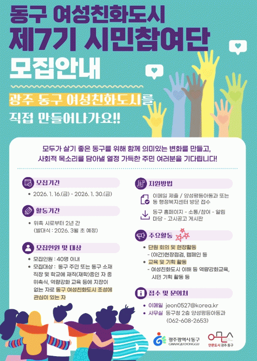 ±¤ÁÖ µ¿±¸´Â ÁÖ¹ÎÀÌ Á÷Á¢ Âü¿©ÇØ ¿©¼ºÄ£È­µµ½Ã Á¤Ã¥À» ¸¸µé¾î°¡´Â ¡®Á¦7±â µ¿±¸ ¿©¼ºÄ£È­µµ½Ã ½Ã¹ÎÂü¿©´Ü¡¯À» ÀÌ´Þ 30ÀϱîÁö ¸ðÁýÇÑ´Ù°í ¹àÇû´Ù. ¿©¼ºÄ£È­µµ½Ã ½Ã¹ÎÂü¿©´ÜÀº ÇàÁ¤ ÁÖµµ°¡ ¾Æ´Ñ ÁֹΠÂü¿© Áß½ÉÀÇ Á¤Ã¥ Çù·Â Á¶Á÷À¸·Î, »ýȰ ÇöÀå¿¡¼­ ´À³¢´Â ¹®Á¦¸¦ ¹ß±¼ÇÏ°í ¿©¼ºÄ£È­ °üÁ¡¿¡¼­ °³¼± ¹æ¾ÈÀ» Á¦¾ÈÇÏ´Â ¿ªÇÒÀ» ¼öÇàÇÑ´Ù. ÁÖ¹ÎÀÇ ½Ã¼±¿¡¼­ Á¤Ã¥À» Á¡°Ë¡¤º¸¿ÏÇÔÀ¸·Î½á ü°¨µµ ³ôÀº ¿©¼ºÄ£È­µµ½Ã¸¦ Á¶¼ºÇÏ´Â µ¥ ¸ñÀûÀÌ ÀÖ´Ù. Á¦7±â ½Ã¹ÎÂü¿©´ÜÀº µ¿±¸¿¡ ÁÖ¼Ò¸¦ µÎ°í Àְųª µ¿±¸ ¼ÒÀç Á÷À塤Çб³¿¡ ´Ù´Ï´Â »ç¶÷À» ´ë»óÀ¸·Î °ø°³ ¸ðÁýÇϸç, 40¸í À̳»·Î ±¸¼ºµÉ ¿¹Á¤ÀÌ´Ù. À§ÃË ±â°£Àº ¿ÃÇØ 3¿ùºÎÅÍ ¿À´Â 2028³â 2¿ù±îÁö 2³â°£ÀÌ´Ù. ½Ã¹ÎÂü¿©´ÜÀº ¡ã¼ºÆòµî ¡ãµ¹º½ ¡ã°æÁ¦ ¡ã¾ÈÀü µî 4°³ ºÐ°ú·Î ³ª´² Ȱµ¿Çϸç, ¿©¼ºÄ£È­µµ½Ã 5´ë ¸ñÇ¥¿¡ µû¸¥ »ç¾÷ ÀÇÁ¦ ¹ß±¼, °ø°ø½Ã¼³ ¹× »ýȰȯ°æ ¸ð´ÏÅ͸µ, Áö¿ª ³» ¼ºÆòµî ¹®È­ È®»êÀ» À§ÇÑ È«º¸ Ȱµ¿ µîÀ» ¼öÇàÇÑ´Ù. ¿ª·®°­È­ ±³À°, ¿öÅ©¼ó, ÇöÀå Ȱµ¿ µîÀ» ÅëÇØ ´Ü¿øµéÀÇ Á¤Ã¥ ÀÌÇØµµ¿Í Ȱµ¿ ¿ª·®À» ³ô¿© ½ÇÈ¿¼º ÀÖ´Â Á¤Ã¥ Á¦¾ÈÀ¸·Î À̾îÁú ¼ö ÀÖµµ·Ï Áö¿øÇÒ °èȹÀÌ´Ù. µ¿±¸´Â Áö³­ 2012³â ¿©¼ºÄ£È­µµ½Ã·Î ÃÖÃÊ ÁöÁ¤µÈ ÀÌÈÄ ÀçÁöÁ¤°ú 3´Ü°è ÁöÁ¤À» °ÅÄ¡¸ç ¿©¼ºÄ£È­ Á¤Ã¥À» ²ÙÁØÈ÷ ÃßÁøÇØ ¿ÔÀ¸¸ç, ƯÈ÷ ½Ã¹ÎÂü¿©´ÜÀ» Áß½ÉÀ¸·Î ÁֹΠÀǰßÀ» ÇàÁ¤¿¡ ¹Ý¿µÇÏ´Â Âü¿©Çü Á¤Ã¥ ¸ðµ¨À» È®´ëÇØ ³ª°¡°í ÀÖ´Ù. Á¦7±â ¿©¼ºÄ£È­µµ½Ã ½Ã¹ÎÂü¿©´Ü ½ÅûÀº µ¿±¸Ã» ¾ç¼ºÆòµî¾Æµ¿°ú ¶Ç´Â µ¿ ÇàÁ¤º¹Áö¼¾Å͸¦ ÅëÇØ À̸ÞÀÏ¡¤¹æ¹® Á¢¼ö·Î ÇÒ ¼ö ÀÖÀ¸¸ç, ±âŸ ÀÚ¼¼ÇÑ »çÇ×Àº µ¿±¸Ã» ´©¸®Áý °ø°í¹®¿¡¼­ È®ÀÎÇÒ ¼ö ÀÖ´Ù. µ¿±¸ °ü°èÀÚ´Â ¡°½Ã¹ÎÂü¿©´ÜÀº ÇàÁ¤ÀÌ ¹Ìó »ìÇDZ⠾î·Á¿î »ýȰ ÇöÀåÀÇ ¸ñ¼Ò¸®¸¦ Á¤Ã¥À¸·Î ¿¬°áÇÏ´Â Áß¿äÇÑ ¿ªÇÒÀ» Çϰí ÀÖ´Ù¡±¸é¼­ ¡°¼ºÆòµî °¡Ä¡¿¡ °ø°¨Çϰí Áö¿ªÀÇ º¯È­¸¦ ÇÔ²² ¸¸µé¾î °¡°íÀÚ ÇÏ´Â ÁֹεéÀÇ ¸¹Àº °ü½É°ú Âü¿©¸¦ ¹Ù¶õ´Ù¡±°í ¸»Çß´Ù.