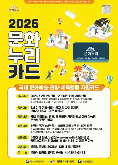 ÀåÈﱺÀº 2¿ù 2ÀϺÎÅÍ 6¼¼ ÀÌ»ó ±âÃʼö±ÞÀÚ ¹× Â÷»óÀ§°èÃþÀ» ´ë»óÀ¸·Î 2026³â ÅëÇÕ¹®È­ÀÌ¿ë±Ç(¹®È­´©¸®Ä«µå) »ç¾÷À» ½Ç½ÃÇÑ´Ù°í ¹àÇû´Ù. ¹®È­´©¸®Ä«µå´Â ¹®È­¿¹¼ú¡¤±¹³»¿©ÇࡤüÀ°È°µ¿ ÀÌ¿ëÀ» Áö¿øÇÏ´Â Á¦µµ·Î, 2026³â¿¡´Â Áö³­ÇØ ´ëºñ 1¸¸ ¿ø ÀλóµÈ ¿¬°£ 15¸¸ ¿øÀÌ Áö¿øµÈ´Ù. ƯÈ÷ û¼Ò³â±â(13~18¼¼)¿Í Áذí·É±â(60~64¼¼) ´ë»óÀÚ´Â 1¸¸ ¿øÀÌ Ãß°¡ Áö¿øµÅ ÃÖ´ë 16¸¸ ¿ø±îÁö ÀÌ¿ëÇÒ ¼ö ÀÖ´Ù. ¿ÃÇØ ÀåÈﱺÀÇ ¹®È­´©¸®Ä«µå Áö¿ø ´ë»óÀÚ´Â ÃÑ 3,394¸íÀ¸·Î, Ä«µå ¹ß±ÞÀº ³»´Þ 2ÀϺÎÅÍ 11¿ù 30ÀϱîÁö °¡´ÉÇϸç, ¿¹»ê ¼ÒÁø ½Ã±îÁö ¼±Âø¼ø ¹ß±ÞÀ̰í, Áö¿ø±Ý »ç¿ë ±â°£Àº ¹ß±ÞÀϷκÎÅÍ 12¿ù 31ÀϱîÁö´Ù. Áö³­ÇØ ¹®È­´©¸®Ä«µå ¹ß±Þ ÈÄ 3¸¸¿ø ÀÌ»ó »ç¿ë ÀÌ·ÂÀÌ ÀÖ°í, ¿ÃÇØµµ ¼ö±ÞÀÚ°ÝÀ» À¯ÁöÇÑ ±âÁ¸ ÀÌ¿ëÀÚ´Â º°µµÀÇ ½Åû ÀýÂ÷ ¾øÀÌ 21ÀϱîÁö ÀÚµ¿ ÀçÃæÀü µÆ´Ù. ÀÚµ¿ ÀçÃæÀü ¿©ºÎ´Â 28ÀϺÎÅÍ Â÷·Ê´ë·Î ¹ß¼ÛµÇ´Â ¹®ÀÚ ¾Ë¸²À» ÅëÇØ È®ÀÎÇÒ ¼ö ÀÖ´Ù. ÀåÈﱺ °ü°èÀڴ¡°¹®È­ ¼Ò¿Ü°èÃþ¿¡ ´Ù¾çÇÑ ¹®È­Àû Ȱµ¿À» Áö¿øÇÏ¸ç ¹®È­°ÝÂ÷ ¿ÏÈ­¸¦ À§ÇØ Àû±Ø ³ë·ÂÇϰڴ١±¸ç¡°¹®È­´©¸®Ä«µå ¹ß±Þ ¹æ¹ý°ú ÀÌ¿ë ¾È³» µî È«º¸¿¡ ÃÖ¼±À» ´ÙÇϰڴ١±°í ÀüÇß´Ù.