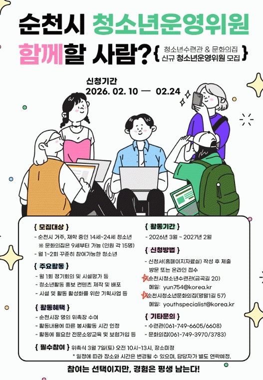 ¼øÃµ½Ã û¼Ò³â¼ö·Ã°ü°ú ¹®È­ÀÇÁýÀº û¼Ò³âÀÇ Âü¿©±Ç È®´ë¿Í û¼Ò³â ģȭÀû ½Ã¼³¿î¿µÀ» À§ÇØ Ã»¼Ò³â¿î¿µÀ§¿øÈ¸¸¦ ¸ðÁýÇÑ´Ù. û¼Ò³â¿î¿µÀ§¿øÈ¸´Â 'û¼Ò³âȰµ¿ÁøÈï¹ý'¿¡ ±Ù°ÅÇÑ Ã»¼Ò³âÂü¿©±â±¸·Î, ¼±¹ßµÈ û¼Ò³â¿î¿µÀ§¿øÀº 2027³â 2¿ù±îÁö û¼Ò³â½Ã¼³ ¹× ÇÁ·Î±×·¥ÀÇ ÀÚ¹® ¹× Æò°¡¿¡ Âü¿©Çϸç ÀǰßÀ» Á¦½ÃÇϰí Ȱµ¿±âȹ¡¤¿î¿µ¡¤½Ã¼³¸ð´ÏÅ͸µ µîÀÇ ¿ªÇÒÀ» ¼öÇàÇÑ´Ù. À̹ø ¸ðÁýÀº ¼øÃµ½Ãû¼Ò³â¼ö·Ã°ü°ú ¹®È­ÀÇÁýÀÌ °øµ¿À¸·Î ÁøÇàÇϸç, ¼±¹ßµÈ û¼Ò³â¿î¿µÀ§¿øµéÀº °¢ ±â°ü¿¡¼­ ½Ã¼³ Ư¼º¿¡ ¸Â´Â Ȱµ¿À» ¼öÇàÇÏ°Ô µÈ´Ù. À̸¦ ÅëÇØ ÁÖüÀûÀÎ Âü¿© °æÇèÀ» ½×À» ¼ö ÀÖÀ» °ÍÀ¸·Î ±â´ëµÈ´Ù. ¸ðÁýÀº 2¿ù 24ÀϱîÁö ¼øÃµ½Ã¿¡ °ÅÁÖÇϰųª °ü³» ÀçÇÐ ÁßÀÎ 9¼¼~24¼¼ û¼Ò³âÀ» ´ë»óÀ¸·Î Çϸç, ÀÚ¼¼ÇÑ »çÇ×Àº °¢ ½Ã¼³ ´©¸®Áý ¹× ¼øÃµ½Ãû¼Ò³â¼ö·Ã°ü ¶Ç´Â ¹®È­ÀÇ ÁýÀ» ÅëÇØ ¾È³»¹ÞÀ» ¼ö ÀÖ´Ù. ½Ã °ü°èÀÚ´Â ¡°Ã»¼Ò³âÀÇ »ý°¢ÀÌ °ð ¿î¿µÀ¸·Î À̾îÁö´Â °æÇèÀ» ÇÒ ¼ö ÀÖ´Â ±âȸÀÎ ¸¸Å­, ¼øÃµÁö¿ª û¼Ò³âµéÀÇ ¸¹Àº °ü½É°ú Âü¿©¸¦ ¹Ù¶õ´Ù¡±°í ¸»Çß´Ù. ÇÑÆí, 2025³â û¼Ò³â¿î¿µÀ§¿øÈ¸´Â û¼Ò³â½Ã¼³ È«º¸È°µ¿°ú ¹ö½ºÅ· ±âȹ¡¤¿î¿µÀ» ¼º°øÀûÀ¸·Î À̲ø¾úÀ¸¸ç, û¼Ò³âÀÇ ½Ã°¢¿¡¼­ Á¦¾ÈÇÑ Á¤Ã¥ÀÇ ¿ì¼ö¼ºÀ» ÀÎÁ¤¹Þ¾Æ Àü¶ó³²µµ ¿Â¶óÀÎ Á¤Ã¥Á¦¾È °ø¸ðÀü¿¡¼­ ¼ö»óÇÏ´Â ¼º°ú¸¦ °Åµ×´Ù.