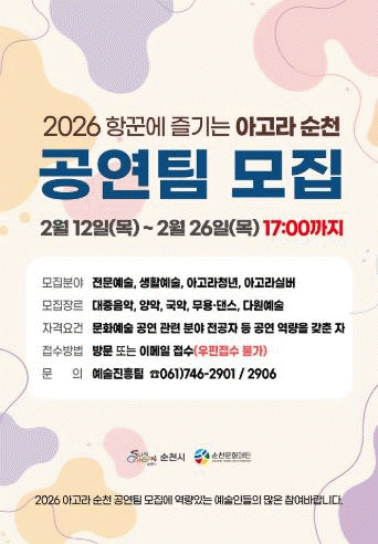 (Àç)¼øÃµ¹®ÈÀç´ÜÀº ¿À´Â 26ÀϱîÁö ¡®2026 Çײۿ¡ Áñ±â´Â ¾Æ°í¶ó ¼øÃµ¡¯ ¹®È¿¹¼ú °ø¿¬ÆÀÀ» °ø°³ ¸ðÁýÇÑ´Ù°í ¹àÇû´Ù.