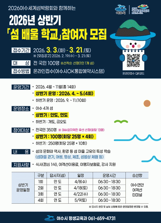 ¿©¼ö½Ã´Â 2026¿©¼ö¼¼°è¼¶¹Ú¶÷ȸÀÇ ¼º°øÀûÀÎ °³ÃÖ¸¦ À§ÇÑ ±¹¹ÎÀû °ü½ÉÀ» ³ôÀ̰í Áö¿ªÆ¯È­Çü ¼¶ ´ä»ç ÇÁ·Î±×·¥À» ÅëÇØ À¯ÀÍÇÑ ÇнÀ°æÇèÀ» Á¦°øÇϰíÀÚ '2026³â »ó¹Ý±â ¼¶¹è¿ïÇб³' Âü¿©ÀÚ¸¦ ¸ðÁýÇÑ´Ù. ¡®¼¶¹è¿ïÇб³¡¯´Â ¿©¼ö ¼¶ÀÇ ¹®È­¡¤¿ª»ç¡¤È¯°æÀû °¡Ä¡¸¦ Á÷Á¢ üÇèÇÏ¸ç ¹è¿ì´Â ÇöÀå Á᫐ Æò»ýÇнÀ ÇÁ·Î±×·¥À¸·Î 2026¿©¼ö¼¼°è¼¶¹Ú¶÷ȸ¿Í ¿¬°èÇØ ¿¬Áß »ó¡¤ÇϹݱâ ÃÑ 14ȸ ¿î¿µµÉ ¿¹Á¤ÀÌ´Ù. ÀÌ °¡¿îµ¥ »ó¹Ý±â¿¡´Â ÃÑ 4ȸ¸¦ ¿î¿µÇÑ´Ù. »ó¹Ý±â ¡®¼¶¹è¿ïÇб³¡¯´Â ¡ã¾Èµµ(2ȸ/4¿ù 8ÀÏ¡¤18ÀÏ), ¡ã¿¬µµ(2ȸ/4¿ù 22ÀÏ¡¤5¿ù 9ÀÏ)¿¡¼­ ÁøÇàµÈ´Ù. Âü°¡ÀÚµéÀº ¼¶ÀÇ ¹®È­¿Í ¿ª»ç, ȯ°æ µî ¼¶¸¶À» °íÀ¯ÀÇ Æ¯¼ºÀ» ¹è¿ì¸ç ¼¶¸¶À» °È±â, ¾î¾Å, ¸í»ó, üÁ¶, ¼¶ ¹ä»ó üÇè µî ´Ùä·Î¿î ÇÁ·Î±×·¥À» °æÇèÇÏ°Ô µÈ´Ù. ¸ðÁýÀοøÀº Àü ±¹¹Î 100¸í(ȸ´ç 25¸í)À̸ç, ÀÌ Áß È¸´ç 13¸íÀº ¿©¼ö ¿Ü Áö¿ª¹ÎÀ» ¿ì¼± ¼±¹ßÇØ Àü±¹ ´ÜÀ§ Âü¿©¸¦ À¯µµÇÒ °èȹÀÌ´Ù. Âü°¡ ½ÅûÀº 3¿ù 3ÀϺÎÅÍ 21ÀϱîÁöÀ̸ç, ¿©¼ö½ÃOKÅëÇÕ¿¹¾à½Ã½ºÅÛÀ» ÅëÇÑ ¿Â¶óÀÎ Á¢¼ö·Î ÁøÇàµÈ´Ù. ¿©¼ö½Ã °ü°èÀÚ´Â ¡°¼¶¹è¿ïÇб³´Â ¼¶À» ´Ü¼øÈ÷ °ü±¤ÇÏ´Â °ÍÀ» ³Ñ¾î, ¼¶ÀÇ »î°ú °¡Ä¡¸¦ ±íÀÌ ÀÌÇØÇÒ ¼ö ÀÖµµ·Ï ±¸¼ºµÈ ÇÁ·Î±×·¥¡±À̶ó¸ç ¡°2026¿©¼ö¼¼°è¼¶¹Ú¶÷ȸ¸¦ ¾ÕµÎ°í ¸¹Àº ±¹¹ÎÀÌ ¿©¼öÀÇ ¼¶À» Á÷Á¢ üÇèÇÏ¸ç °ü½É°ú °ø°¨´ë¸¦ ³ÐÇô°¡±æ ±â´ëÇÑ´Ù¡±°í ¸»Çß´Ù.