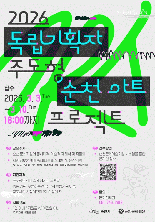 (Àç)¼øÃµ¹®È­Àç´ÜÀº Àü±¹ÀÇ Ã¢ÀÇÀûÀÎ µ¶¸³±âȹÀÚ¿Í ¼øÃµÀÇ ¿¹¼úÀÎÀ» ¿¬°áÇÏ¿© Áö¿ª¹®È­ÀÇ »õ·Î¿î °¡Ä¡¸¦ âÃâÇϴ¡®2026 µ¶¸³±âȹÀÚ ÁÖµµÇü ¼øÃµ ¾ÆÆ® ÇÁ·ÎÁ§Æ®¸¦ °ø¸ðÇÑ´Ù. À̹ø »ç¾÷Àº ±âȹÀÚÀÇ µ¶Ã¢ÀûÀÎ ½Ã°¢ÀÌ Áö¿ª ¿¹¼ú ÇöÀå¿¡ ½º¸çµé¾î ¿¹¼úÀÎÀÇ ±âȹÀû ¿µ°¨À» È®ÀåÇϰí, ³ª¾Æ°¡ ¼øÃµ¸¸ÀÇ µ¶º¸ÀûÀÎ ¹®È­ ºê·£µå¸¦ ±¸ÃàÇϱâ À§ÇØ ¸¶·ÃµÆ´Ù. °ø¸ðÁÖÁ¦´Â ¡ã¼øÃµ ¹®È­ÀÚ¿øÀÇ µ¿½Ã´ëÀû¡¤¿¹¼úÀû ÀçÇØ¼® ¹× ÀÛǰȭ ¡ã½Ã¹Î Âü¿©Çü ¿¹¼úÃàÁ¦(¾ÆÆ®Æä½ºÆ¼¹ú) ¹× ³­Àå ±âȹ Áß 1°¡Áö¸¦ ¼±ÅÃÇÏ¸é µÇ¸ç, À帣±¸ºÐ ¾øÀÌ À¶žº¹Ç