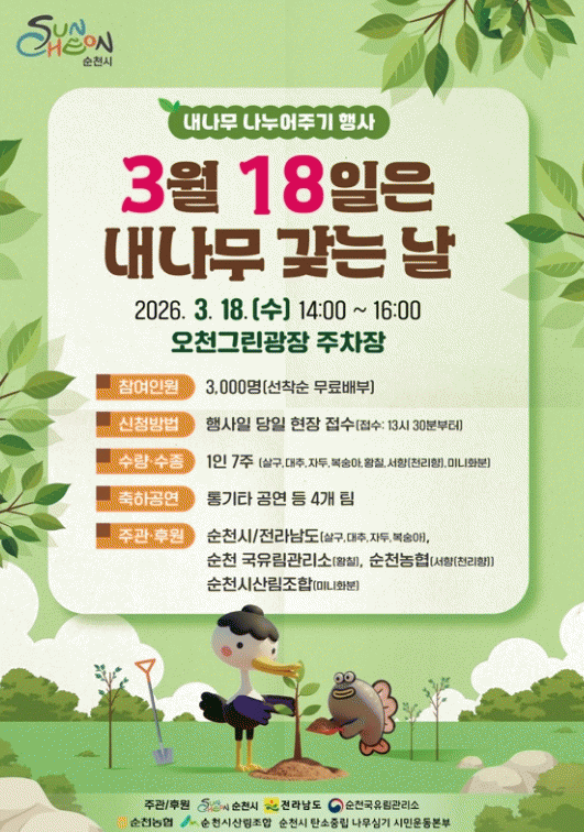 ¼øÃµ½Ã´Â ¿À´Â 3¿ù 18ÀÏ ¿ÀÈÄ 2½Ã ¿Àõ±×¸°±¤Àå ÁÖÂ÷Àå¿¡¼­ '³»³ª¹« ³ª´©¾îÁÖ±â Çà»ç'¸¦ °³ÃÖÇÑ´Ù°í ¹àÇû´Ù. º»°ÝÀûÀÎ º½ ½Ä¼ööÀ» ¸Â¾Æ ½Ã¹Îµé¿¡°Ô ³ª¹« ½É±âÀÇ Á߿伺À» ¾Ë¸®°í ź¼ÒÁ߸³½ÇÇö µµ½Ã Á¶¼ºÀ» À§ÇÑ ½Ã¹Î Âü¿©¸¦ µ¶·ÁÇϱâ À§ÇØ ¸¶·ÃµÈ À̹ø Çà»ç´Â Áö³­ÇØ ½Ã¹ÎµéÀÇ ³ôÀº È£ÀÀ¿¡ ÈûÀÔ¾î ¿ÃÇØµµ µ¿ÀÏÇÑ ±Ô¸ð·Î ÃßÁøµÈ´Ù. Àü¶ó³²µµ, ¼øÃµ±¹À¯¸²°ü¸®¼Ò, ¼øÃµ³óÇù, ¼øÃµ½Ã»ê¸²Á¶ÇÕ°ú Çù·ÂÇÏ¿© °ú½Ç¼ö ¹× Á¶°æ¼ö, ¹Ì´ÏÈ­ºÐ µî ÃÑ 21,000ÁÖÀÇ ¹¦¸ñÀ» ÁغñÇß´Ù. ¹èºÎ ¹¦¸ñÀº ´ëÃß¡¤»ì±¸¡¤ÀڵΡ¤º¹¼þ¾Æ µî À¯½Ç¼ö¿Í Ȳĥ, ¼­Çâ(õ¸®Çâ), ¹Ì´ÏÈ­ºÐ µî ÃÑ 7Á¾ÀÌ´Ù. Çà»ç ´çÀÏ ¼±Âø¼ø ÇöÀåÁ¢¼ö¸¦ ÅëÇØ ¼øÃµ½Ã¹Î 3,000¸í¿¡°Ô 1Àδç 7ÁÖ¾¿ ¹«·á·Î ¹èºÎÇÒ °èȹÀÌ´Ù. ´ë±â½Ã°£¿¡´Â Åë±âŸ °ø¿¬ µî ´Ùä·Î¿î ¹®È­°ø¿¬µµ ÁøÇàµÉ ¿¹Á¤ÀÌ´Ù. ½Ã °ü°èÀÚ´Â ¡°À̹ø Çà»ç¸¦ ÅëÇØ ½Ã¹ÎµéÀÌ »ýȰ ¼Ó¿¡¼­ ³ª¹«¸¦ ½É°í °¡²Ù´Â ½ÇõÀ» À̾¸ç, ź¼ÒÁ߸³ ½ÇÇö¿¡ µ¿ÂüÇÏ´Â °è±â°¡ µÇ±â¸¦ ±â´ëÇÑ´Ù¡±°í ¸»Çß´Ù.