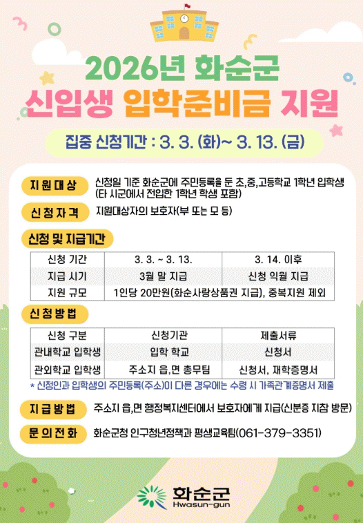 È­¼ø±ºÀº 2026Çг⵵ ÃÊ?Áß?°íµîÇб³ ½ÅÀÔ»ý °¡Á¤ÀÇ ±³À°ºñ ºÎ´ãÀ» ¿ÏÈ­ÇÏ°í º¸ÆíÀû ±³À°º¹Áö¸¦ ½ÇÇöÇϱâ À§ÇØ ÀÔÇÐÁغñ±Ý 1Àδç 20¸¸ ¿øÀ» È­¼ø»ç¶û»óǰ±ÇÀ¸·Î Áö¿øÇÑ´Ù°í 27ÀÏ ¹àÇû´Ù. Áö¿ø ´ë»óÀº »ç¾÷ ±â°£ ³» ½ÅûÀÏ ±âÁØ È­¼ø±º¿¡ Áֹεî·ÏÀ» µÐ ÃÊ?Áß?°íµîÇб³ 1Çгâ ÀÔÇлýÀ¸·Î, Ÿ ½Ã?±º¿¡¼­ ÀüÀÔÇÑ 1Çгâ Çлýµµ Æ÷ÇԵȴÙ. ´Ù¸¸, ´Ù¸¥ ¹ý·É ¶Ç´Â Á¶·Ê¿¡ µû¶ó ÀÔÇÐ °ü·Ã ºñ¿ëÀ» Áö¿ø¹ÞÀº °æ¿ì¿¡´Â Áߺ¹ Áö¿øÀÌ Á¦ÇѵȴÙ. »ç¾÷ ±â°£Àº 2026³â 3¿ùºÎÅÍ 11¿ù±îÁöÀ̸ç, ƯÈ÷ 3¿ù 3ÀϺÎÅÍ 3¿ù 13ÀϱîÁö¸¦ ÁýÁß ½Åû ±â°£À¸·Î ¿î¿µÇØ ½Å¼ÓÇÑ Áö±ÞÀ» ÃßÁøÇÒ °èȹÀÌ´Ù. ÀÌÈÄ¿¡µµ ÀüÀÔ µî ¿ä°ÇÀ» ÃæÁ·ÇÏ¸é »ç¾÷ ±â°£ ³» ¼ö½Ã ½ÅûÀÌ °¡´ÉÇÏ´Ù. ½ÅûÀº º¸È£ÀÚ°¡ ÇÒ ¼ö ÀÖ´Ù. °ü³» Çб³ ÀÔÇлýÀº ÇØ´ç Çб³¿¡ ½Åû¼­¸¦ Á¦ÃâÇÏ¸é µÇ¸ç, °ü¿Ü Çб³ ÀÔÇлýÀº ÁÖ¼ÒÁö À¾?¸é ÇàÁ¤º¹Áö¼¾Å͸¦ ¹æ¹®ÇØ ½ÅûÇÏ¸é µÈ´Ù. ±ºÀº ½Åû Àû°Ý ¿©ºÎ¸¦ È®ÀÎÇÑ ÈÄ 3¿ù ÁýÁß ½ÅûºÐÀº 3¿ù ¸» Áö±Þ, ÀÌÈÄ ½ÅûºÐÀº ½ÅûÇÑ ´ÞÀÇ ÀÍ¿ù¿¡ Áö±ÞÇÒ ¿¹Á¤ÀÌ´Ù. º¸È£ÀÚ´Â Áö±Þ ¾È³» ¿¬¶ôÀ» ¹ÞÀº µÚ ½ÅºÐÁõÀ» ÁöÂüÇØ ÁÖ¼ÒÁö À¾?¸é ÇàÁ¤º¹Áö¼¾ÅÍ Ãѹ«ÆÀ¿¡¼­ ¼ö·ÉÀÌ °¡´ÉÇÏ´Ù. Á¶¹ÌÈ­ Àα¸Ã»³âÁ¤Ã¥°úÀåÀº ¡°À̹ø »ç¾÷À» ÅëÇØ ÀÔÇÐ Ãʱ⠱³À°ºñ ºÎ´ãÀ» ÁÙÀ̰í, ¸ðµç Çлý¿¡°Ô ±ÕµîÇÑ ±³À° ±âȸ¸¦ Á¦°øÇÔÀ¸·Î½á ±³À°ÀÇ ÇüÆò¼ºÀ» °­È­°Ú´Ù¡±¶ó°í ¸»Çß´Ù. ÀÌ¾î ¡°Áö¿ªÈ­Æó Áö±ÞÀ» ÅëÇØ Áö¿ª ³» ¼Òºñ¸¦ ÃËÁøÇϰí Áö¿ª°æÁ¦ Ȱ¼ºÈ­¿¡µµ ±â¿©ÇÒ °ÍÀ¸·Î ±â´ëÇÑ´Ù¡±¶ó°í ¹àÇû´Ù. ÇÑÆí, ÀÔÇÐÁغñ±Ý Áö¿ø°ú °ü·ÃÇÑ ±âŸ ÀÚ¼¼ÇÑ »çÇ×Àº È­¼ø±º Àα¸Ã»³âÁ¤Ã¥°ú Æò»ý±³À°ÆÀ ¹× °¢ À¾?¸é Ãѹ«ÆÀÀ¸·Î ¹®ÀÇÇÏ¸é µÈ´Ù.