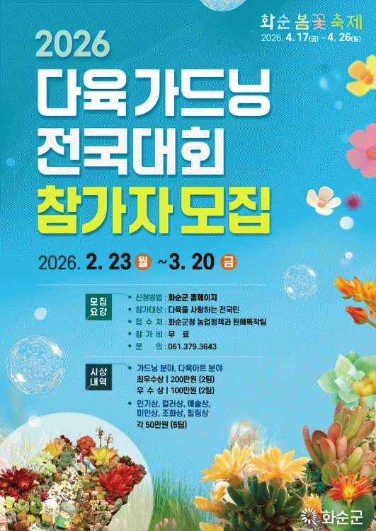 È­¼ø±ºÀº 2¿ù 23ÀϺÎÅÍ 3¿ù 20ÀϱîÁö ¡®2026 ´ÙÀ° °¡µå´× Àü±¹´ëȸ¡¯ Âü°¡ÀÚ¸¦ ¸ðÁýÇÑ´Ù°í ¹àÇû´Ù. ¿ÃÇØ·Î 4³â Â÷ÀÎ À̹ø ´ëȸ´Â 3¿ù Áß 1Â÷ ¼­·ù½É»ç·Î »çÁø °ø¸ð¸¦ ÅëÇØ 30ÆÀ(¿¹ºñ 2ÆÀ Æ÷ÇÔ)À» ¼±¹ßÇϰí, 4¿ù 18ÀÏ¿¡ 2Â÷ ÇöÀå Æò°¡¸¦ °ÅÃÄ ÃÖÁ¾ ¼ö»óÀÛÀ» ¼±Á¤ÇÑ´Ù. Âü°¡ ´ë»óÀº ´ÙÀ°½Ä¹°À» »ç¶ûÇÏ´Â ´©±¸³ª °¡´ÉÇϸç, ½ÅûÀº È­¼ø±º ȨÆäÀÌÁö ³» Âü°¡ ½Åû ÆäÀÌÁö¿¡¼­ Å×ÀÌºí ²Ù¹Ì±â »çÁøÀ» ¾÷·ÎµåÇØ Á¦ÃâÇÏ¸é µÈ´Ù. ´ëȸ´Â ¡ã´ÙÀ°°¡µå´× ºÎ¹® ¡ã´ÙÀ°¾ÆÆ® ºÎ¹®À¸·Î ³ª´µ¾î ÁøÇàµÈ´Ù. ´ÙÀ° °¡µå´× ºÎ¹®Àº ¡ã¾Æ¸§´Ù¿î ¼öÇü ¡ã°¨°¢Àû Ç¥Çö·Â ¡ãÈ­ºÐ°ú ²ÉÀÇ Á¶È­ µîÀ» Áß½ÉÀ¸·Î Æò°¡Çϸç, ´ÙÀ°¾ÆÆ® ºÎ¹®Àº ¡ãÈ­¼øÀ» Ç¥ÇöÇÑ ÁÖÁ¦ ¿¬°ü¼º ¡ãµ¶Ã¢¼º¡¤±ÕÇü¼º ¡ã¼ÒÀç¿Í ´ÙÀ°½Ä¹° Ȱ¿ë¼º µîÀ» Á¾ÇÕ Æò°¡ÇØ ¼ö»óÀÚ¸¦ ¼±Á¤ÇÑ´Ù. ¼ö»óÀº 2°³ ºÐ¾ß¿¡ ´ëÇØ °¢°¢ ÃÖ¿ì¼ö»ó(2ÆÀ) 200¸¸ ¿ø, ¿ì¼ö»ó(2ÆÀ) 100¸¸ ¿øÀ» ¼ö¿©Çϸç, Âü°¡ÀÛ Áß Àαâ»ó µî 6ÆÀ¿¡´Â °¢ 50¸¸ ¿øÀÇ ½Ã»ó±ÝÀ» Áö±ÞÇÑ´Ù. À̹ø ´ëȸ ÃâǰÀÛ°ú ¼ö»óÀÛÀº 4¿ù 17ÀϺÎÅÍ 26ÀϱîÁö ¿­¸®´Â ¡®2026 È­¼ø º½²É ÃàÁ¦¡¯ ±â°£ µ¿¾È È­¼ø ÇÏ´Ï¿ò ½ºÆ÷Ã÷¹®È­¼¾ÅÍ ²É°­±æ ÀÏ¿ø¿¡ Àü½ÃµÉ ¿¹Á¤ÀÌ´Ù. ÃÖÀÎȯ ³ó¾÷Á¤Ã¥°úÀåÀº ¡°È­¼ø º½²É ÃàÁ¦¿Í ¿¬°èÇÑ ´ÙÀ° °¡µå´× Àü±¹´ëȸ¸¦ ÅëÇØ ¹Ý·Á½Ä¹° ¹®È­ È®»ê°ú âÀÇÀûÀÎ °¡µå´× ÀÛǰ ¹ß±¼¿¡ Èû¾²°Ú´Ù¡±¶ó¸ç, ¡°¾ÕÀ¸·Îµµ ¿ø¿¹¡¤¹Ý·Á½Ä¹° »ê¾÷ÀÇ ¼ºÀå ±â¹ÝÀ» ¸¶·ÃÇϰí Áö¿ª°æÁ¦¸¦ Ȱ¼ºÈ­·Î À̾îÁöµµ·Ï Çϰڴ١±¶ó°í ¸»Çß´Ù. ±âŸ ±Ã±ÝÇÑ »çÇ×Àº È­¼ø±º ³ó¾÷Á¤Ã¥°ú ¿ø¿¹Æ¯ÀÛÆÀÀ¸·Î ¹®ÀÇÇÏ¸é µÈ´Ù.