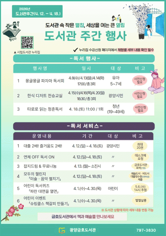 ±¤¾ç±ÝÈ£µµ¼°üÀÌ 4¿ù µµ¼°üÁÖ°£À» ¸Â¾Æ ½Ã¹ÎÀÌ Ã¥°ú ¿¹¼úÀ» ÇÔ²² Áñ±æ ¼ö ÀÖµµ·Ï ´Ù¾çÇÑ Æ¯º° ÇÁ·Î±×·¥À» ¿î¿µÇÑ´Ù.