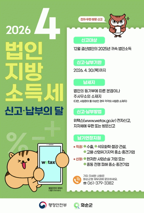 È­¼ø±ºÀº 2025³â 12¿ù ¸» °á»ê¹ýÀÎÀ» ´ë»óÀ¸·Î ¿À´Â 4¿ù 30ÀϱîÁö ¹ýÀÎÁö¹æ¼Òµæ¼¼ ÁýÁß ½Å°í¡¤³³ºÎ ±â°£À» ¿î¿µÇÑ´Ù°í ¹àÇû´Ù. ¹ýÀÎÁö¹æ¼Òµæ¼¼´Â ¹ýÀμ¼ ³³¼¼Àǹ«°¡ ÀÖ´Â ¹ýÀÎÀÌ ¹ýÀμҵæÀ» °ú¼¼Ç¥ÁØÀ¸·Î Áö¹æÀÚÄ¡´Üü¿¡ ³³ºÎÇÏ´Â ¼¼±ÝÀÌ´Ù. ¼ÒµæÀÌ ¾ø°Å³ª °á¼Õ±ÝÀÌ ÀÖ´Â ¹ýÀεµ ½Å°í ´ë»ó¿¡ Æ÷ÇԵȴÙ. ³³¼¼Áö´Â »ç¾÷¿¬µµ Á¾·áÀÏ ÇöÀç ¹ýÀεî±âºÎ »ó º»Á¡ ¶Ç´Â Áֻ繫¼Ò ¼ÒÀçÁö´Ù. ´Ù¸¸, »ç¾÷ÀåÀÌ µÑ ÀÌ»óÀÇ Áö¹æÀÚÄ¡´Üü¿¡ ÀÖ´Â °æ¿ì¿¡´Â »ç¾÷À庰 ¾ÈºÐÀ²¿¡ µû¶ó °¢°¢ ½Å°í¡¤³³ºÎÇØ¾ß ÇÑ´Ù. ƯÈ÷ ÇϳªÀÇ Áö¹æÀÚÄ¡´Üü¿¡¸¸ Àϰý ½Å°íÇÒ °æ¿ì, ³ª¸ÓÁö »ç¾÷Àå¿¡ ´ëÇØ¼­´Â ¹«½Å°í °¡»ê¼¼°¡ ºÎ°úµÉ ¼ö ÀÖ¾î °¢º°ÇÑ ÁÖÀǰ¡ ÇÊ¿äÇÏ´Ù. ¶ÇÇÑ ¹ýÀμ¼ ³³ºÎ ±âÇÑÀÌ 3°³¿ù ¿¬ÀåµÈ ¼öÃâ±â¾÷°ú ¼®À¯È­ÇС¤Ã¶°­¡¤°Ç¼³¾÷ µî °í¿ë¡¤»ê¾÷À§±â¼±Á¦´ëÀÀÁö¿ª ¼ÒÀç Áß¼Ò±â¾÷Àº º°µµÀÇ ½Åû ¾øÀÌ Á÷±ÇÀ¸·Î ¹ýÀÎÁö¹æ¼Òµæ¼¼ ³³ºÎ ±âÇÑÀÌ 7¿ù ¸»±îÁö ¿¬ÀåµÈ´Ù. Á÷±Ç¿¬Àå ´ë»óÀÌ ¾Æ´Ï´õ¶óµµ Áßµ¿ ÀüÀï ÇÇÇØ¸¦ ÀÔÀº Áß¼Ò±â¾÷À̳ª »ç¾÷¿¡ ÇöÀúÇÑ ¼Õ½ÇÀÌ ¹ß»ýÇÑ ±â¾÷Àº ½ÅûÀ» ÅëÇØ ³³ºÎ ±âÇÑÀ» ÃÖ´ë 12°³¿ù±îÁö ¿¬ÀåÇÒ ¼ö ÀÖ´Ù. ´Ù¸¸ ³³ºÎ ±âÇѸ¸ ¿¬ÀåµÇ´Â ¸¸Å­ ½Å°í´Â ¹Ýµå½Ã 4¿ù 30ÀϱîÁö ¿Ï·áÇØ¾ß ÇÑ´Ù. ±¸ÇöÁø À繫°úÀåÀº ¡°¹ýÀÎÀÇ ¼¼±Ý ºÎ´ã ¿ÏÈ­¸¦ À§ÇØ ³³ºÎ¼¼¾×ÀÌ 100¸¸ ¿øÀ» ÃʰúÇÏ´Â °æ¿ì ½ÅûÀ» ÅëÇØ ºÐÇÒ³³ºÎÇÒ ¼ö ÀÖ´Ù¡±¶ó¸ç, ¡°Æí¸®ÇÑ À§Åýº¸¦ ÅëÇØ ±âÇÑ ³» ÀüÀÚ½Å°í¸¦ ¿Ï·áÇϰí, ±âÇÑ °æ°ú·Î ÀÎÇÑ °¡»ê¼¼ µî ºÒÀÌÀÍÀ» ¹ÞÁö ¾Êµµ·Ï À¯ÀÇÇØ ÁÖ½Ã±æ ¹Ù¶õ´Ù¡±¶ó°í ´çºÎÇß´Ù.