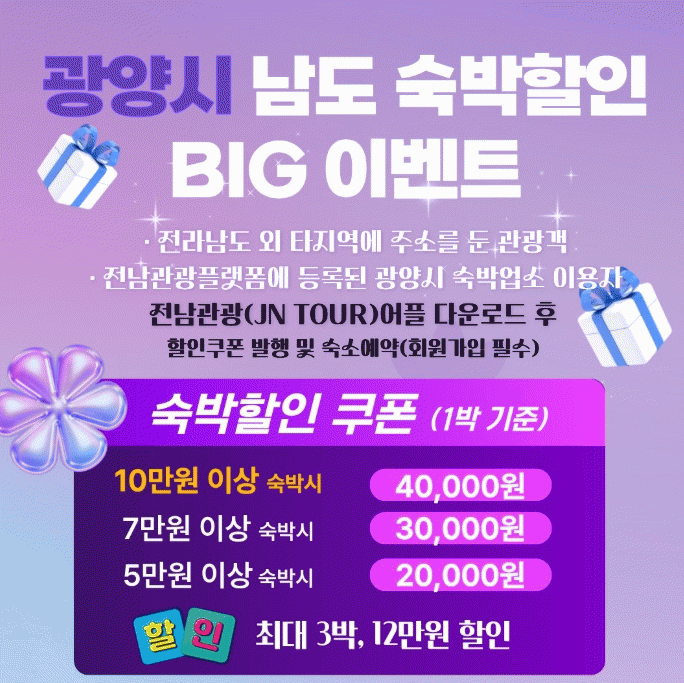 ±¤¾ç½Ã°¡ º½Ã¶ °ü±¤ ¼ö¿ä Áõ°¡¿¡ ¸ÂÃç Àü¶ó³²µµ¿Í ÇÔ²² ÃßÁøÇÏ´Â ¡®2026 ³²µµ ¼÷¹ÚÇÒÀÎ ºò(BIG) À̺¥Æ®¡¯¸¦ ÅëÇØ ü·ùÇü °ü±¤°´ À¯Ä¡¿¡ ³ª¼±´Ù. À̹ø À̺¥Æ®´Â Àü¶ó³²µµ¿Í ±¤ÁÖ±¤¿ª½Ã¸¦ Á¦¿ÜÇÑ Áö¿ª¿¡ ÁÖ¼Ò¸¦ µÐ °ü±¤°´ÀÌ Àü³² Áö¿ª ¼÷¹Ú¾÷¼Ò¸¦ ÀÌ¿ëÇÒ °æ¿ì ÇÒÀÎ ÇýÅÃÀ» Á¦°øÇÏ´Â »ç¾÷À¸·Î, 4¿ùºÎÅÍ 11¿ù±îÁö ¿¹»ê ¹üÀ§ ³»¿¡¼­ ¿î¿µµÈ´Ù. ÇÒÀÎ ±Ý¾×Àº ¼÷¹Ú¿ä±Ý¿¡ µû¶ó Â÷µî Àû¿ëµÈ´Ù. ¡ã10¸¸ ¿ø ÀÌ»ó °áÁ¦ ½Ã 4¸¸ ¿ø ¡ã7¸¸ ¿ø ÀÌ»ó °áÁ¦ ½Ã 3¸¸ ¿ø ¡ã5¸¸ ¿ø ÀÌ»ó °áÁ¦ ½Ã 2¸¸ ¿øÀ» ÇÒÀÎ ¹ÞÀ» ¼ö ÀÖÀ¸¸ç, ¿ù 1ȸ ÃÖ´ë 3¹Ú ÀÌ¿ë ½Ã ÃÖ´ë 12¸¸ ¿øÀÇ ÇÒÀÎ ÇýÅÃÀÌ Á¦°øµÈ´Ù. À̺¥Æ® Âü¿©¸¦ Èñ¸ÁÇÏ´Â °ü±¤°´Àº Àü³²°ü±¤Ç÷§Æû(JN TOUR)¿¡ ȸ¿ø°¡ÀÔÇÑ µÚ ¡®³²µµ ¼÷¹ÚÇÒÀÎ BIG À̺¥Æ®¡¯¿¡¼­ ¡®±¤¾ç½Ã¡¯¸¦ ¼±ÅÃÇØ ÄíÆùÀ» ¹ß±Þ¹ÞÀ¸¸é µÈ´Ù. ¹ß±Þ¹ÞÀº ÄíÆùÀº Ç÷§Æû¿¡ µî·ÏµÈ ¼÷¹Ú¾÷¼Ò¿¡¼­¸¸ »ç¿ëÇÒ ¼ö ÀÖ´Ù. ÄíÆùÀ» ´çÀÏ »ç¿ëÇÏÁö ¾ÊÀ¸¸é ÀÚµ¿À¸·Î ¼Ò¸êµÇ¸ç, ´ÙÀ½ ³¯ºÎÅÍ ´Ù½Ã ¹ß±Þ¹ÞÀ» ¼ö ÀÖ´Ù. ¶ÇÇÑ ¡®Àü³² »ç¶û¾Ö(äñ) ¼­Æ÷ÅÍÁ Ãß°¡ ÇÒÀεµ ±âÁ¸ 1¸¸ ¿ø¿¡¼­ 1¸¸ 5õ ¿øÀ¸·Î ´Ã¾î³µ´Ù. ±¤¾ç½Ã °ü°èÀÚ´Â ¡°À̹ø ¼÷¹ÚÇÒÀÎ À̺¥Æ®°¡ °ü±¤°´ÀÇ ¹æ¹®À» ü·ù¿Í Àç¹æ¹®À¸·Î ÀÕ´Â °è±â°¡ µÇ±æ ¹Ù¶õ´Ù¡±¸ç ¡°¼÷¹Ú ÇÒÀΰú Áö¿ª °ü±¤À» ¿¬°èÇØ Áö¿ª ¼÷¹Ú¾÷¼Ò ÀÌ¿ëÀ» Ȱ¼ºÈ­Çϰí Áö¿ª°æÁ¦¿¡µµ µµ¿òÀÌ µÇµµ·Ï Çϰڴ١±°í ¸»Çß´Ù. ÇÑÆí, ±¤¾ç½Ã´Â À̹ø »ç¾÷°ú ¿¬°èÇØ Áö¿ª °ü±¤ÀÚ¿ø°ú ¼÷¹ÚÀ» °áÇÕÇÑ Ã¼·ùÇü °ü±¤ ÄÜÅÙÃ÷¸¦ Áö¼ÓÀûÀ¸·Î È®´ëÇØ ³ª°¥ °èȹÀÌ´Ù.