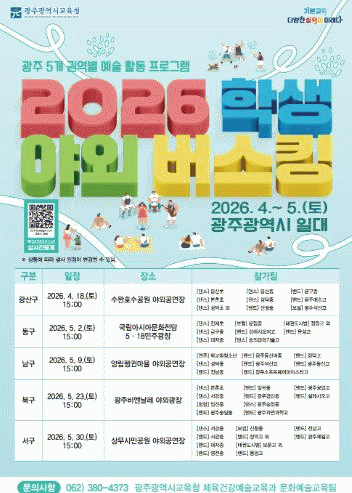 ±¤Áֽñ³À°Ã»ÀÌ ¿À´Â 18ÀϺÎÅÍ 5¿ù 30ÀϱîÁö ±¤ÁÖ 5°³ ÀÚÄ¡±¸¿¡¼­ 45ÆÀ, 348¸íÀÌ Âü¿©ÇÏ´Â ¡®2026 Çлý ¾ß¿Ü¹ö½ºÅ·¡¯À» °³ÃÖÇÑ´Ù. ¡®Çлý ¾ß¿Ü¹ö½ºÅ·¡¯Àº ½Ã±³À°Ã»ÀÌ ÇлýµéÀÇ ´Ù¾çÇÑ ²Þ°ú ³¢¸¦ Ű¿ï ¼ö ÀÖµµ·Ï Áö¿øÇϱâ À§ÇØ Áö³­ 2023³â ½ÃÀÛÇÑ Çлý ¿¹¼ú Ȱµ¿ ÇÁ·Î±×·¥ÀÌ´Ù. ±¤ÁÖ ÇлýÀº ¹°·Ð ±¤ÁÖ¿¡ °ÅÁÖÇÏ´Â Çб³ ¹Û û¼Ò³â ´©±¸³ª Âü°¡ÇÒ ¼ö ÀÖ´Ù. Áö³­ 2023³â 38ÆÀ, 2024³â 43ÆÀ, 2025³â 57ÆÀÀÌ Âü°¡ÇØ ³¢¿Í Àç´ÉÀ» ¼±º¸¿´´Ù. ¿ÃÇØ ¡®Çлý ¾ß¿Ü¹ö½ºÅ·¡¯Àº ¡ã18ÀÏ ¿ÀÈÄ 3½Ã ±¤»ê±¸ ¼ö¿ÏÈ£¼ö°ø¿ø ¾ß¿Ü°ø¿¬Àå °ø¿¬À» ½ÃÀÛÀ¸·Î ¡ã5¿ù 2ÀÏ ¿ÀÈÄ 3½Ã µ¿±¸ ±¹¸³¾Æ½Ã¾Æ¹®È­Àü´ç 5¡¤18¹ÎÁÖ±¤Àå ¾ß¿Ü¹«´ë ¡ã5¿ù 9ÀÏ ¿ÀÈÄ 3½Ã ³²±¸ ¾ç¸² Æë±Ï¸¶À» ¾ß¿Ü°ø¿¬Àå ¡ã5¿ù 23ÀÏ ¿ÀÈÄ 3½Ã ºÏ±¸ ºñ¿£³¯·¹ ¾ß¿Ü±¤Àå ¡ã5¿ù 30ÀÏ ¿ÀÈÄ 3½Ã ¼­±¸ »ó¹«½Ã¹Î°ø¿ø ¾ß¿Ü°ø¿¬Àåµî 5°³ ÀÚÄ¡±¸¿¡¼­ °¢ ÇÑ Â÷·Ê¾¿ ÃÑ 5¹ø ¿î¿µµÈ´Ù. ÇлýµéÀº °¢ ÀÚÄ¡±¸ ¾ß¿Ü °ø¿¬ Àå¼Ò¿¡¼­ ´í½º, ¹êµå, º¸ÄÃ, ¿¬ÁÖ, űǵµ ½Ã¹ü µî ´Ù¾çÇÑ ¹®È­¿¹¼ú °ø¿¬À» ¼±º¸ÀÏ ¿¹Á¤ÀÌ´Ù. ¹Úö¿µ ±³À°±¹ÀåÀº ¡°ÀÏ»óÀÌ Çàº¹ÇØÁö´Â ¿¹¼ú Ȱµ¿°ú ´©±¸³ª ´©¸®°í Áñ±â´Â ¹®È­¿¹¼ú ±â¹Ý Á¶¼ºÀ» À§ÇØ Çлý Âü¿© Áß½ÉÀÇ ¿¹¼ú Ȱµ¿À» Àû±Ø Áö¿øÇϰڴ١±¸ç ¡°ÇлýµéÀÇ ¿­Á¤°ú Àç´ÉÀ¸·Î °¡µæ ä¿öÁú Çлý ¾ß¿Ü ¹ö½ºÅ· ¹«´ë¿¡ ¸¹Àº ½Ã¹ÎµéÀÇ °ü½ÉÀ» ºÎʵ台´Ù¡±°í ¸»Çß´Ù.