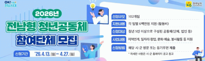 Àü¶ó³²µµ°¡ û³âÀÇ Áö¿ª Á¤Âø°ú Ȱµ¿ ±â¹Ý ¸¶·ÃÀ» À§ÇØ ¡®2026 Àü³²Çü û³â°øµ¿Ã¼ Ȱ¼ºÈ­ »ç¾÷¡¯¿¡ Âü¿©ÇÒ 102°³ ÆÀÀ» ¸ðÁýÇÑ´Ù. ½Åû ±â°£Àº ¿À´Â 27ÀϱîÁö´Ù. Âü¿©¸¦ ¹Ù¶ó´Â û³â°øµ¿Ã¼´Â ÇØ´ç ½Ã±º ´ã´ç ºÎ¼­¿¡ ½ÅûÇÏ¸é µÈ´Ù. À̹ø »ç¾÷Àº Áö¿ª¿¡¼­ Ȱµ¿ ÁßÀΠû³â 5ÀÎ ÀÌ»óÀ¸·Î ±¸¼ºµÈ ÆÀ¡¤¹ýÀΡ¤´Üü¸¦ ´ë»óÀ¸·Î Çϸç, ¼±Á¤µÈ °øµ¿Ã¼¿¡´Â ÆÀ´ç 600¸¸ ¿øÀÇ È°µ¿ºñ¿Í Ãâ¹ü½Ä, ¼º°ú°øÀ¯È¸, ±Ç¿ªº° ³×Æ®¿öÅ© Çà»ç, ¿Â¶óÀÎ È«º¸ µîÀ» Áö¿øÇÑ´Ù. ƯÈ÷ ¿ÃÇØºÎÅʹ Ȱµ¿ ºÐ¾ß¸¦ ¡ãÁö¿ª ¿¬°è ¡ãÀÏÀÚ¸®¡¤Ã¢¾÷ ¡ã¹®È­¡¤¿¹¼ú ¡ãºÀ»çȰµ¿ µî 4°³ ºÐ¾ß·Î ±¸ºÐÇϰí, °øÀÍÀû ±â¿© Ȱµ¿À» Àǹ«È­ÇØ °øµ¿Ã¼ÀÇ Ã¥ÀÓ¼º°ú °ø°ø¼ºÀ» °­È­ÇÒ °èȹÀÌ´Ù. Àü³²µµ´Â Áö³­ 2019³âºÎÅÍ Àü³²Çü û³â°øµ¿Ã¼ Ȱ¼ºÈ­ Áö¿ø»ç¾÷À» ÃßÁøÇϰí ÀÖÀ¸¸ç, ¿¬¸» ¼º°ú°øÀ¯È¸¸¦ ÅëÇØ ¿ì¼ö»ç·Ê¸¦ Áö¼Ó ¹ß±¼¡¤È®»êÇϰí ÀÖ´Ù. Áö³­ÇØ ÃÖ¿ì¼ö»óÀ» ¹ÞÀº ¿µ±¤±º ¡®´óÈ÷¾î·ÎÁ´Â ¹Ý·Áµ¿¹°°úÀÇ À̺°·Î ÀÎÇÑ »ó½Ç°¨À» Ä¡À¯ÇÏ´Â ÇÁ·Î±×·¥À» ¿î¿µÇÏ´Â µî âÀÇÀû Ȱµ¿À» ÆîÃÄ ¸ð¹ü»ç·Ê·Î ÁÖ¸ñ¹Þ¾Ò´Ù. Á¤ÇýÁ¤ Àü³²µµ û³âÈñ¸Á°úÀåÀº ¡°Ã»³â°øµ¿Ã¼ÀÇ ÀÚÀ²Àû Ȱµ¿À» Áö¿øÇÏ´Â °ÍÀ» ³Ñ¾î Áö¿ª»çȸ¿Í ¿¬°èµÈ ½ÇÁúÀû ¼º°ú âÃâ¿¡ ÁßÁ¡À» µÎ°í ÀÖ´Ù¡±¸ç ¡°Âü½ÅÇÑ ¾ÆÀ̵ð¾î¿Í ½Çõ ÀÇÁö¸¦ °®Ãá û³â°øµ¿Ã¼ÀÇ ¸¹Àº °ü½É°ú Âü¿© ¹Ù¶õ´Ù¡±°í ¸»Çß´Ù.