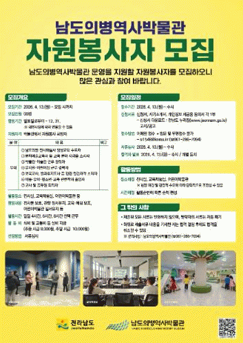 Àü¶ó³²µµ°¡ ³²µµÀǺ´¿ª»ç¹Ú¹°°ü ¿î¿µÀ» Áö¿øÇÒ Àü½Ã¡¤±³À°¡¤Ã¼Çè ºÐ¾ß ÀÚ¿øºÀ»çÀÚ¸¦ ¸ðÁýÇÑ´Ù. ÀÌ´Â ¹Ú¹°°ü °³°ü ÀÌÈÄ ´Ã¾î³ª´Â °ü¶÷°´ ¼ö¿ä¿¡ ´ëÀÀÇϰí, º¸´Ù ü°èÀûÀ̰í Áú ³ôÀº Àü½Ã¡¤±³À°¡¤Ã¼Çè ¼­ºñ½º¸¦ Á¦°øÇϱâ À§ÇÑ °ÍÀÌ´Ù. ¸ðÁý ´ë»óÀº ¹Ú¹°°ü ÀÚ¿øºÀ»ç Ȱµ¿À» ¹Ù¶ó´Â ´©±¸³ª Áö¿øÇÒ ¼ö ÀÖ´Ù. ¹Ú¹°°ü¡¤¹Ì¼ú°ü ±Ù¹« °æÇèÀÚ, ±³À°¡¤¾Æµ¿¡¤Ã»¼Ò³â °ü·Ã Àü°øÀÚ³ª °ü·Ã ÀÚ°ÝÁõ ¼ÒÁöÀÚ µîÀ» ¿ì´ëÇÑ´Ù. ÀÚ¿øºÀ»çÀÚ´Â ±³À°Ã¼Çè½Ç°ú ¾î¸°À̹ڹ°°ü¿¡ ¹èÄ¡µÅ ¿î¿µ º¸Á¶, üÇèȰµ¿ Áö¿ø, °ü¶÷ Áú¼­ À¯Áö µî ¿ªÇÒÀ» ÇÑ´Ù. Ȱµ¿Àº ÇÏ·ç 4¡¤6¡¤8½Ã°£ Áß ¼±Åà °¡´ÉÇϸç, Ȱµ¿ ½Ã°£¿¡ µû¶ó ½Çºñ°¡ Áö±ÞµÈ´Ù. ½ÅûÀº Àü³²µµ ´©¸®Áý½Åû¼­¸¦ ³»·Á¹Þ¾Æ ÀüÀÚ¿ìÆíÀ¸·Î Á¢¼öÇÏ¸é µÈ´Ù. ¼­·ù½É»ç¸¦ ÅëÇØ ¼ö½Ã ¼±¹ßÇÏ¸ç °á°ú´Â °³º° ÅëÁöÇÑ´Ù. ¹ÚÁßȯ ³²µµÀǺ´¿ª»ç¹Ú¹°°üÀåÀº ¡°¹Ú¹°°ü ÀÚ¿øºÀ»çÀڷΠȰµ¿ÇÏ´Â °ÍÀº Áö¿ª ¿ª»ç¸¦ ÁöŰ°í °¡²Ù´Â ÀÏ¿¡ ÁÖ¿ªÀÌ µÇ´Â ¸Å¿ì ¶æ±íÀº ±âȸ¡±¶ó¸ç ¡°À̹ø ¸ðÁý¿¡ ¿ª·® ÀÖ´Â ºÐµéÀÇ ¸¹Àº °ü½É°ú Âü¿© ¹Ù¶õ´Ù¡±°í ¸»Çß´Ù.