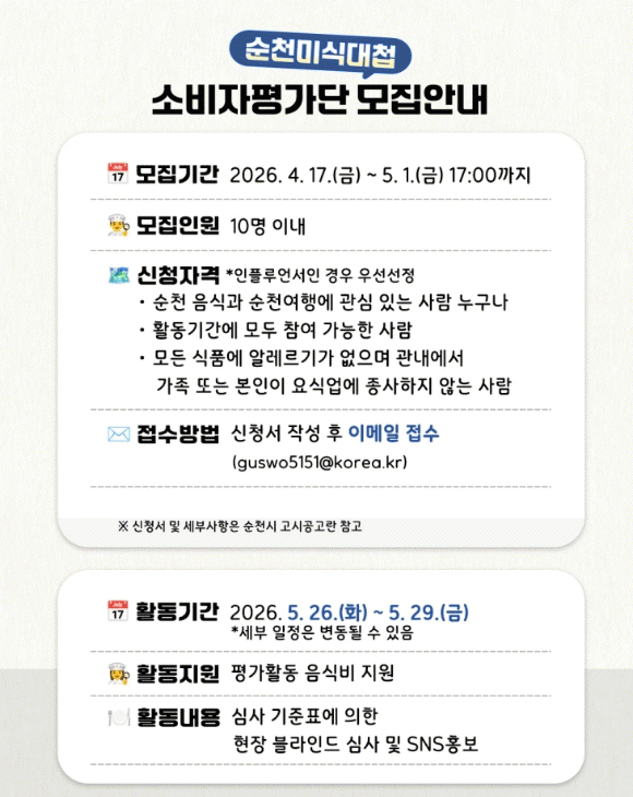 ¼øÃµ½Ã´Â ¿À´Â 5¿ù °³ÃÖ ¿¹Á¤ÀÎ 'Á¦11ȸ ¼øÃµ¹Ì½Ä´ëø'À» ¾ÕµÎ°í, ¼ÒºñÀÚ ºí¶óÀÎµå ½É»ç¿¡ Âü¿©ÇÒ ¡®¼ÒºñÀÚ Æò°¡´Ü¡¯À» 4¿ù 17ÀϺÎÅÍ 5¿ù 1ÀϱîÁö ¸ðÁýÇÑ´Ù°í ¹àÇû´Ù. ¼ÒºñÀÚ Æò°¡´ÜÀº ÃÑ 10¸í À̳»·Î ¼±¹ßµÇ¸ç, ¼øÃµ À½½Ä°ú ¿©Çà¿¡ °ü½É ÀÖ´Â »ç¶÷À̶ó¸é ´©±¸³ª Áö¿øÇÒ ¼ö ÀÖ´Ù. ¿Ü±¹ÀÎÀÇ °æ¿ì ¼øÃµ¿¡ °ÅÁÖÇϸç Çѱ¹¾î·Î ÀÇ»ç¼ÒÅëÀÌ °¡´ÉÇÏ¸é ½ÅûÇÒ ¼ö ÀÖ´Ù. ¶ÇÇÑ Æò°¡´ÜÀº ½É»ç Á¾·á¿Í ¼ö»ó¾÷¼Ò ¹ßÇ¥ ÀÌÈÄ, Ȱµ¿ °úÁ¤¿¡¼­ ÃÔ¿µÇÑ À½½Ä »çÁø µîÀ» Ȱ¿ëÇØ SNS È«º¸¿¡µµ Âü¿©ÇÏ°Ô µÈ´Ù. ´Ù¸¸, ½É»ç ³»¿ëÀº ºñ°ø°³·Î À¯ÁöµÇ¸ç, °ü·Ã °Ô½Ã¹°Àº »çÀü ÇùÀǸ¦ °ÅÃÄ¾ß ÇÑ´Ù. Æò°¡´Ü Áö¿øÀº ¼øÃµ½Ã ȨÆäÀÌÁö¿¡¼­ ½Åû¼­¸¦ ³»·Á¹Þ¾Æ ÀÛ¼ºÇÑ µÚ À̸ÞÀÏ·Î ½Åû °¡´ÉÇϸç, SNS ¿î¿µÀÚ³ª °ü·Ã Ȱµ¿ °æÇèÀÌ ÀÖ´Â Áö¿øÀÚ´Â ¿ì´ëµÈ´Ù. ½Ã °ü°èÀÚ´Â ¡°¼ÒºñÀÚ ½Ã°¢¿¡¼­ Á÷Á¢ Æò°¡ÇÏ´Â À̹ø ÇÁ·Î±×·¥À» ÅëÇØ Áö¿ªÀÇ °æÀï·Â ÀÖ´Â ºñ°Ç À½½ÄÁ¡À» ¹ß±¼Çϰí, Ä¡À¯µµ½Ã ¼øÃµ°ú Á¢¸ñ½ÃŰ´Â ¹Ì½Ä ÄÜÅÙÃ÷·Î ´õ¿í °­È­ÇÒ °èȹ¡±À̶ó¸ç ¡°¹Ì½Ä°ú ¿©Çà¿¡ °ü½É ÀÖ´Â ½Ã¹ÎµéÀÇ ¸¹Àº Âü¿©¸¦ ¹Ù¶õ´Ù¡±°í ¸»Çß´Ù.