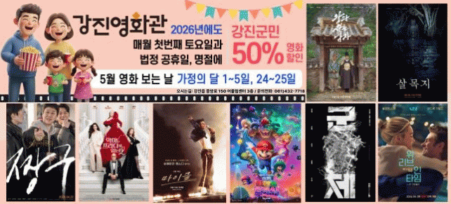°­Áø±ºÀÌ °¡Á¤ÀÇ ´Þ 5¿ùÀ» ¸Â¾Æ °­Áø¿µÈ­°ü ¡®¿µÈ­ º¸´Â ³¯¡¯ Çà»ç¸¦ ¿î¿µÇÑ´Ù. ¡®¿µÈ­ º¸´Â ³¯¡¯Àº °­Áø±ºÀÌ ±º¹ÎÀÇ ¹®È­ ÇâÀ¯ ±âȸ¸¦ ³ÐÈ÷°íÀÚ ¿¬Áß ÃßÁøÇÏ´Â Çà»ç·Î, °øÈÞÀϰú ¸Å¿ù ù ¹øÂ° Åä¿äÀϸ¶´Ù °­Áø±º¹Î¿¡°Ô ¿µÈ­ °ü¶÷·á 50% ÇÒÀÎ ÇýÅÃÀ» Á¦°øÇÑ´Ù. °­Áø±ºÀº À̹ø Çà»ç°¡ ¿Â °¡Á·ÀÌ ÇÔ²² ¿µÈ­¸¦ Áñ±â¸ç ÀÏ»ó ¼Ó ¹®È­»ýȰÀ» ´©¸®´Â ±âȸ°¡ µÉ °ÍÀ¸·Î ±â´ëÇÑ´Ù. 5¿ù Çà»ç´Â ÃÑ 7Àϰ£ ÁøÇàµÈ´Ù. ³ëµ¿ÀýÀÎ 1ÀÏ, ¾î¸°À̳¯ ¿¬ÈÞ°¡ Æ÷ÇÔµÈ 2ÀϺÎÅÍ 5ÀÏ, ºÎó´Ô ¿À½Å ³¯ ¿¬ÈÞÀÎ 24ÀϺÎÅÍ 25ÀϱîÁö ¿î¿µµÈ´Ù. Çà»ç ´çÀÏ °­Áø±º¹ÎÀº ½ÅºÐÁõ µî ÁÖ¼Ò È®ÀÎÀÌ °¡´ÉÇÑ Áõºù ÀڷḦ Á¦½ÃÇϸé ÇÒÀÎ ÇýÅÃÀ» ¹ÞÀ» ¼ö ÀÖ´Ù. °­Áø¿µÈ­°üÀº °³°ü 1³â µ¿¾È ¾ÈÁ¤ÀûÀÎ ¿î¿µÀ» ¹ÙÅÁÀ¸·Î ±º¹ÎÀÇ ´ëÇ¥ ¹®È­ °ø°£À¸·Î ÀÚ¸®¸Å±èÇϰí ÀÖ´Ù. ´Ù¾çÇÑ ¿µÈ­ »ó¿µ°ú ÇÒÀÎ Çà»ç·Î ±º¹ÎµéÀÇ È£ÀÀÀ» ¾òÀº °á°ú, °­Áø¿µÈ­°üÀº 4¿ù ±âÁØ ´©Àû °ü¶÷°´ÀÌ °­Áø±º Àα¸¸¦ ³Ñ¾î¼­´Â ¼º°ú¸¦ °Åµ×´Ù. À̹ø 5¿ù Çà»ç¸¦ ÅëÇØ °­Áø¿µÈ­°üÀÌ ¿Â °¡Á·ÀÌ ÇÔ²² Áñ±â´Â »ýȰ ¹ÐÂøÇü ¹®È­ °ø°£À¸·Î¼­ÀÇ Àǹ̸¦ ´õÇÒ °ÍÀ¸·Î º¸ÀδÙ. °­Áø±º °ü°èÀÚ´Â ¡°°¡Á¤ÀÇ ´ÞÀ» ¸Â¾Æ ±º¹ÎµéÀÌ °¡Á·°ú ÇÔ²² ºÎ´ã ¾øÀÌ ¿µÈ­¸¦ Áñ±â¸ç ¼ÒÁßÇÑ ½Ã°£À» º¸³¾ ¼ö Àֱ⸦ ¹Ù¶õ´Ù¡±¶ó¸ç ¡°¾ÕÀ¸·Îµµ ÀÏ»ó °¡±îÀÌ¿¡¼­ ´Ù¾çÇÑ ¹®È­ ÇâÀ¯ ±âȸ¸¦ ´©¸± ¼ö ÀÖµµ·Ï ¿î¿µ¿¡ Èû¾²°Ú´Ù¡±°í ¸»Çß´Ù.