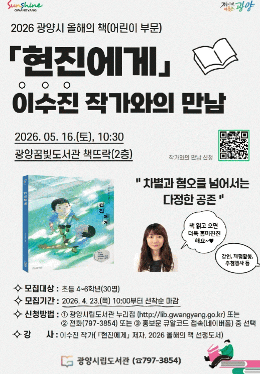 ±¤¾ç½Ã´Â ¿À´Â 5¿ù 16ÀÏ ¿ÀÀü 10½Ã 30ºÐ ²Þºûµµ¼­°ü¿¡¼­ ¡®2026³â ¿ÃÇØÀÇ Ã¥¡¯ ¾î¸°ÀÌ ºÎ¹® ¼±Á¤ µµ¼­'ÇöÁø¿¡°Ô'ÀÇ ÀúÀÚ À̼öÁø ÀÛ°¡¸¦ ÃÊÃ»ÇØ °­¿¬À» ¿¬´Ù°í ¹àÇû´Ù. À̹ø °­¿¬Àº ½Ã¸³µµ¼­°üÀÌ ÃßÁøÇÏ´Â ¡®½Ã¹Î ÇÑ Ã¥ Àб⡯ »ç¾÷ÀÇ Çϳª·Î, Áö¿ª ¾î¸°À̵éÀÌ ÀÛ°¡¿Í Á÷Á¢ ¸¸³ª ÀÛǰÀÇ ÁÖÁ¦¿Í Àǹ̸¦ ÀÌÇØÇÒ ¼ö ÀÖµµ·Ï ¸¶·ÃµÆ´Ù. À̼öÁø ÀÛ°¡´Â È­°¡ ÀÌÁß¼·ÀÇ »îÀ» ¹ÙÅÁÀ¸·Î ¼­·Î¿¡°Ô ¼ÕÀ» ³»¹Ì´Â ¿ë±â¸¦ ´ãÀº µ¿È­ 'ÇöÁø¿¡°Ô'¸¦ Áß½ÉÀ¸·Î ¡®Â÷º°°ú Çø¿À¸¦ ³Ñ¾î¼­´Â ´ÙÁ¤ÇÑ °øÁ¸¡¯À» ÁÖÁ¦·Î °­¿¬À» ÁøÇàÇÑ´Ù. ¶ÇÇÑ ¾î¸°À̵éÀÌ Â÷º°°ú È­ÇØÀÇ °¡Ä¡¸¦ Á÷Á¢ üÇèÇÒ ¼ö ÀÖ´Â ¿ªÇұذú ÆíÁö¾²±â ÇÁ·Î±×·¥µµ ÇÔ²² ¿î¿µÇÑ´Ù. ¸ðÁý ´ë»óÀº ÃʵîÇб³ 4ÇгâºÎÅÍ 6Çгâ±îÁö ¾î¸°ÀÌÀ̸ç, ¸ðÁý ÀοøÀº ¼±Âø¼ø 30¸íÀÌ´Ù. Âü¿© ½ÅûÀº 4¿ù 23ÀÏ ¿ÀÀü 10½ÃºÎÅÍ È«º¸¹° Á¤º¸¹«´Ì(QRÄÚµå) Á¢¼Ó, ÀüÈ­, ±¤¾ç½Ã¸³µµ¼­°ü ´©¸®ÁýÀ» ÅëÇØ ÇÏ¸é µÈ´Ù. ±¤¾ç½Ã °ü°èÀÚ´Â ¡°À̹ø °­¿¬ÀÌ ¾î¸°À̵éÀÌ ÀÛǰÀ» ÀÌÇØÇÏ´Â µ¥ µµ¿òÀÌ µÇ±æ ¹Ù¶õ´Ù¡±¸ç ¡°Ã¥À» Àд Áñ°Å¿ò°ú »ý°¢À» ³ª´©´Â ±â»ÝÀ» ´À³¢´Â ½Ã°£ÀÌ µÉ °Í¡±À̶ó°í ¸»Çß´Ù. 2026³â ±¤¾ç½Ã ¡®¿ÃÇØÀÇ Ã¥ ÇÔ²² Àб⡯ »ç¾÷°ú °ü·ÃÇÑ ÀÚ¼¼ÇÑ »çÇ×Àº µµ¼­°üÁö¿øÆÀÀ¸·Î ¹®ÀÇÇÏ¸é µÈ´Ù.