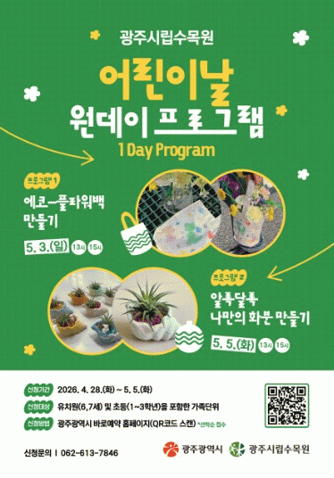 ±¤ÁÖ±¤¿ª½Ã ½Ã¸³¼ö¸ñ¿øÀº ¾î¸°ÀÌ °¡Á·ÀÌ ÇÔ²² ÇÏ´Â ¡®¼ö¸ñ¿ø ¾î¸°À̳¯ ¿øµ¥ÀÌ ÇÁ·Î±×·¥¡¯ Âü°¡ÀÚ¸¦ ¿À´Â 28ÀϺÎÅÍ ¼±Âø¼ø ¸ðÁýÇÑ´Ù. ÀÌ ÇÁ·Î±×·¥Àº ¼ö¸ñ¿ø ±³À°½Ç¿¡¼­ 5¿ù3Àϰú 5¿ù5ÀÏ ÀÌÆ² µ¿¾È ÇÏ·ç µÎ Â÷·Ê¾¿ ¹«·á·Î ÁøÇàÇÑ´Ù. ¿î¿µ ½Ã°£Àº ¿ÀÈÄ 1½Ã¿Í 3½ÃÀÌ´Ù. ÇÁ·Î±×·¥Àº ¾î¸°À̵éÀÌ Ã¢ÀÇÀûÀΠȰµ¿À» ÅëÇØ ½Ä¹°°ú ÀÚ¿¬À» ´õ¿í Ä£±ÙÇÏ°Ô ´À³¥ ¼ö ÀÖµµ·Ï ½Ä¹°°ú ¿¬°èÇÑ Ã¼Çè Ȱµ¿ Áß½ÉÀ¸·Î ±¸¼ºÇß´Ù. 5¿ù3ÀÏ¿¡´Â ģȯ°æ °¡¹æ(¿¡ÄÚ¹é)¿¡ ±×¸²À» ±×¸° ÈÄ È­º´À» ´ã¾Æ ²É²ÈÀ̸¦ ÇÏ´Â ¡®¿¡ÄÚ-Çöó¿ö¹é ¸¸µé±â¡¯¸¦ ÁøÇàÇÑ´Ù. 5¿ù5ÀÏ¿¡´Â ¡®¾Ë·Ï´Þ·Ï ³ª¸¸ÀÇ È­ºÐ ¸¸µé±â¡¯¸¦ ÅëÇØ ¼Ò¶ó ¸ð¾ç È­ºÐÀ» ¸¸µç ÈÄ ½Ä¹°À» ½É´Â´Ù. Âü°¡ ´ë»óÀº 6¡­7¼¼ À¯¾Æ³ª ÃʵîÇб³ 1¡­3Çг⠾À̸¦ Æ÷ÇÔÇÑ °¡Á· ´ÜÀ§ ¹æ¹®°´À¸·Î, ¾î¸°À̰¡ º¸È£ÀÚ¿Í ÇÔ²² Âü¿©ÇÒ ¼ö ÀÖµµ·Ï ¿î¿µÇÑ´Ù. ȸÂ÷º° ¸ðÁý ÀοøÀº 20¸íÀÌ´Ù. Âü°¡ ½ÅûÀº ±¤Áֽà ¹Ù·Î¿¹¾à ´©¸®ÁýÀ» ÅëÇØ ¼±Âø¼øÀ¸·Î Á¢¼öÇϸç, ÀÜ¿© Àοø¿¡ ÇÑÇØ ÇöÀå Á¢¼öµµ °¡´ÉÇÏ´Ù. ±¤Áֽø³¼ö¸ñ¿øÀº ½£Çؼ³ ÇÁ·Î±×·¥°ú ȯ°æ»ýÅ ±³À°ÇÁ·Î±×·¥ µîÀ» Áö¼Ó ¿î¿µÇÏ¸ç ¾î¸°À̵éÀÌ ÀÚ¿¬°ú »ýÅ¿¡ ´ëÇÑ ÀÌÇØ¸¦ ³ôÀÏ ¼ö ÀÖµµ·Ï Èû¾µ °èȹÀÌ´Ù. ±èÈñ¼® ¼ö¸ñ¿ø¡¤Á¤¿ø»ç¾÷¼ÒÀåÀº ¡°¾î¸°À̳¯À» ¸Â¾Æ ¾ÆÀ̵éÀÌ ÀÚ¿¬ ¼Ó¿¡¼­ Áñ°Ì°Ô ½Ä¹°°ú Ä£ÇØÁú ¼ö ÀÖµµ·Ï ÇÁ·Î±×·¥À» ÁغñÇß´Ù¡±¸ç ¡°°¡Á·ÀÌ ÇÔ²² üÇèȰµ¿À» Çϸç ÀÇ¹Ì ÀÖ´Â ½Ã°£À» º¸³»±æ ¹Ù¶õ´Ù¡±°í ¸»Çß´Ù.