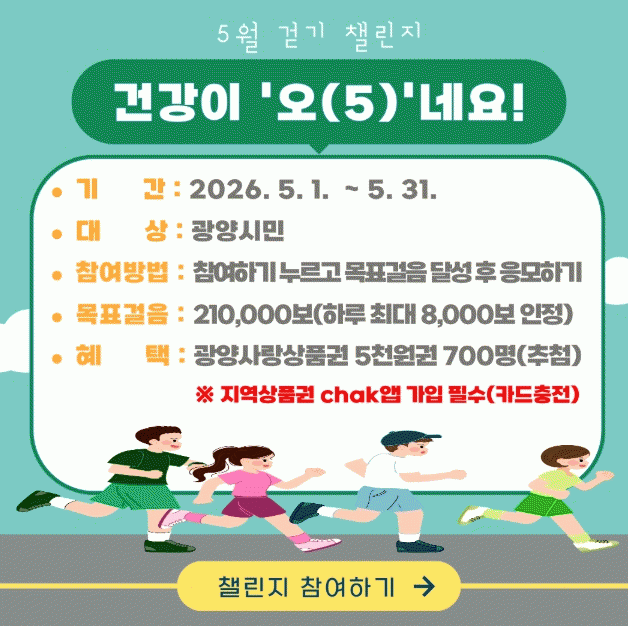 ±¤¾ç½Ã´Â ¿À´Â 5¿ù 1ÀϺÎÅÍ 5¿ù 31ÀϱîÁö ¸ð¹ÙÀÏ °È±â ¾Û ¿öÅ©¿ÂÀ» Ȱ¿ëÇÑ ¡®°Ç°­ÀÌ ¿À(5)³×¿ä! 5¿ù °È±â 縰Áö¡¯¸¦ ¿î¿µÇÑ´Ù°í 24ÀÏ ¹àÇû´Ù. À̹ø 縰Áö´Â ÇÏ·ç ÃÖ´ë 8õ °ÉÀ½±îÁö ÀÎÁ¤µÇ¸ç, ±â°£ ³» ´©Àû 21¸¸ º¸¸¦ ´Þ¼ºÇÑ Âü¿©ÀÚ´Â ±¤¾ç»ç¶û»óǰ±Ç 5õ ¿ø±Ç ÀÀ¸ð ÀÚ°ÝÀÌ ÁÖ¾îÁø´Ù. ½Ã´Â ¸ñÇ¥ °ÉÀ½ ¼ö¸¦ ´Þ¼ºÇÑ Âü¿©ÀÚ Áß Ãß÷À» ÅëÇØ 700¸í¿¡°Ô »óǰ±ÇÀ» Áö±ÞÇÒ °èȹÀÌ´Ù. ±¤¾ç½Ã¹Î ´©±¸³ª Âü¿©ÇÒ ¼ö ÀÖÀ¸¸ç, Âü¿©¸¦ Èñ¸ÁÇÏ´Â ½Ã¹ÎÀº ¸ð¹ÙÀÏ °È±â ¾Û ¿öÅ©¿ÂÀ» ¼³Ä¡ÇÑ µÚ ¡®±¤¾ç½Ã °ø½Ä Ä¿¹Â´ÏƼ¡¯¿¡ °¡ÀÔÇÑ ÈÄ Ã§¸°Áö ¸Þ´º¿¡¼­ ±¤¾ç½Ã °È±â 縰Áö ¡®Âü¿©Çϱ⡯¸¦ ¼±ÅÃÇØ ½º¸¶Æ®ÆùÀ» ¼ÒÁöÇÏ°í °ÉÀ¸¸é µÈ´Ù. 縰Áö Âü¿© ½Ã¿¡´Â ±¤¾ç Áö¿ª Á¦ÇÑ ¼³Á¤À¸·Î ÈÞ´ëÀüÈ­ À§Ä¡ ±â´ÉÀ» Ȱ¼ºÈ­ÇØ¾ß Çϸç, ÀÚ¼¼ÇÑ »çÇ×Àº ±¤¾ç½Ãº¸°Ç¼Ò·Î ¹®ÀÇÇÏ¸é µÈ´Ù. ±¤¾ç½Ã °ü°èÀÚ´Â ¡°°È±â´Â Àϻ󿡼­ ½±°Ô ½ÇõÇÒ ¼ö ÀÖ´Â °Ç°­ ½À°ü¡±À̶ó¸ç ¡°À̹ø 縰Áö¸¦ ÅëÇØ ½Ã¹ÎµéÀÌ °È±âÀÇ Áñ°Å¿òÀ» ´À³¢°í °Ç°­ÇÑ »ýȰÀ» À̾±æ ¹Ù¶õ´Ù¡±°í ¸»Çß´Ù. ÇÑÆí, ±¤¾ç½Ã´Â ½Ã¹Î °Ç°­ ÁõÁø°ú »ýȰ ¼Ó ½ÅüȰµ¿ Ȱ¼ºÈ­¸¦ À§ÇØ ¸ð¹ÙÀÏ °È±â ¾Û ¿öÅ©¿ÂÀ» Ȱ¿ëÇÑ °È±â 縰Áö¸¦ ¸Å¿ù ¿î¿µÇϰí ÀÖÀ¸¸ç, ÇöÀç ±¤¾ç½Ã °ø½Ä Ä¿¹Â´ÏƼ¿¡´Â 1¸¸ 869¿© ¸íÀÌ °¡ÀÔÇØ Âü¿©Çϰí ÀÖ´Ù.