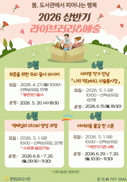 À̹ø ÇÁ·Î±×·¥Àº 5¿ù°ú 6¿ù µÎ ´Þ°£ ¡ã°Ç° ¡ã»öä ½É¸® ¡ã°íÀü Àб⠡ã¹Ì¼úǰ ½ÃÀå µîÀ» ÁÖÁ¦·Î ÁøÇàµÇ¸ç, ½Ã¹ÎµéÀÇ ¹®È ÇâÀ¯ ±âȸ¸¦ ³ÐÈ÷°í °¡Á·ÀÌ ÇÔ²²ÇÏ´Â ¿©°¡ ½Ã°£À» Á¦°øÇϱâ À§ÇØ ¸¶·ÃµÆ´Ù.