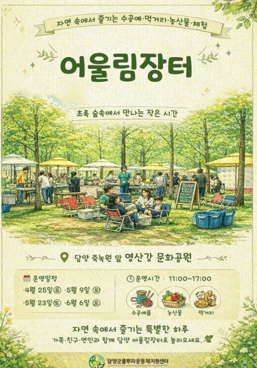 ´ã¾ç±º Ç®»Ñ¸®°øµ¿Ã¼Áö¿ø¼¾ÅͰ¡ Áö¿ª °øµ¿Ã¼¿Í ¼Ò»ó°øÀÎÀÇ »ó»ýÀ» µ½°í Áö¿ª °æÁ¦¸¦ »ì¸®±â À§ÇÑ ¡®2026³â ¾î¿ï¸²ÀåÅÍ¡¯¸¦ ¿À´Â 6¿ù±îÁö ÃÑ 4ȸ ¿î¿µÇÑ´Ù. ¡®¾î¿ï¸²ÀåÅÍ¡¯´Â ´ã¾ç °ü³» Ç®»Ñ¸®°øµ¿Ã¼¿Í ³óÃÌÀÎÀç¾ç¼º°úÁ¤À» ÅëÇØ À°¼ºµÈ ¸¶À»°øµ¿Ã¼, ¸¶À»±â¾÷, »çȸÀû°æÁ¦Á¶Á÷, ¼Ò±Ô¸ð »ý»êÀÚ µîÀÌ Âü¿©ÇÏ´Â ÆÇ¸Å¡¤Ã¼ÇèÇü ÀåÅÍ·Î, Áö¿ª »ý»êǰÀÇ È«º¸¿Í ÆÇ·Î È®´ë¸¦ ¸ñÀûÀ¸·Î ÃßÁøµÈ´Ù. ¿ÃÇØ ÀåÅÍ´Â Á×³ì¿ø ¸ÂÀºÆí ¿µ»ê°­ ¹®È­°ø¿ø ÀÏ´ë¿¡¼­ ¿­¸°´Ù. ¾à 29°³¼ÒÀÇ ÆÇ¸ÅÀÚ°¡ Âü¿©ÇØ ³ó»ê¹°°ú °¡°ø½Äǰ, ¼ö°ø¿¹Ç° µî Áö¿ª Ư»öÀ» »ì¸° ´Ù¾çÇÑ »óǰÀ» ¼±º¸ÀÏ °èȹÀÌ´Ù. ¼¾ÅÍ´Â ÀåÅÍ ¿î¿µ¿¡ ¾Õ¼­ Âü¿©ÀÚ ¸ðÁý°ú ±âȹ ȸÀÇ, È«º¸¹° Á¦ÀÛ µî »çÀü Áغñ¸¦ ü°èÀûÀ¸·Î ÃßÁøÇßÀ¸¸ç, °Ç°­Áø´Ü°á°ú¼­(º¸°ÇÁõ)¿Í Àӽà ÆÇ¸Å Çã°¡Áõ µî °ü·Ã ÇàÁ¤ ÀýÂ÷¸¦ Áö¿øÇØ Âü¿©ÀÚµéÀÌ ¾ÈÁ¤ÀûÀ¸·Î ¿î¿µÇÒ ¼ö ÀÖ´Â ±â¹ÝÀ» ¸¶·ÃÇÒ ¹æÄ§ÀÌ´Ù. Ç®»Ñ¸®°øµ¿Ã¼Áö¿ø¼¾ÅÍ °ü°èÀÚ´Â ¡°¾î¿ï¸²ÀåÅÍ´Â Áö¿ª °øµ¿Ã¼¿Í ¼Ò»ó°øÀÎÀÌ ÇÔ²² ¼ºÀåÇÏ´Â »ó»ýÀÇ Åä´ë¡±¶ó¸ç ¡°Áö¼ÓÀûÀÎ ¿î¿µÀ» ÅëÇØ ´ã¾çÇü Áö¿ª ¼øÈ¯ °æÁ¦ ¸ðµ¨À» ±¸ÃàÇØ ³ª°¡°Ú´Ù¡±°í ¸»Çß´Ù. ÇÑÆí, ¼¾ÅÍ´Â ÀåÅÍ ¿î¿µ ÀÌÈÄ ¼º°ú °øÀ¯¿Í Æò°¡È¸¸¦ ¿­¾î °³¼± »çÇ×À» ¹Ý¿µÇϰí, ÇâÈÄ Áö¿ª °øµ¿Ã¼ Áß½ÉÀÇ °æÁ¦ Ȱ¼ºÈ­ »ç¾÷À» ´õ¿í È®´ëÇÒ °èȹÀÌ´Ù.